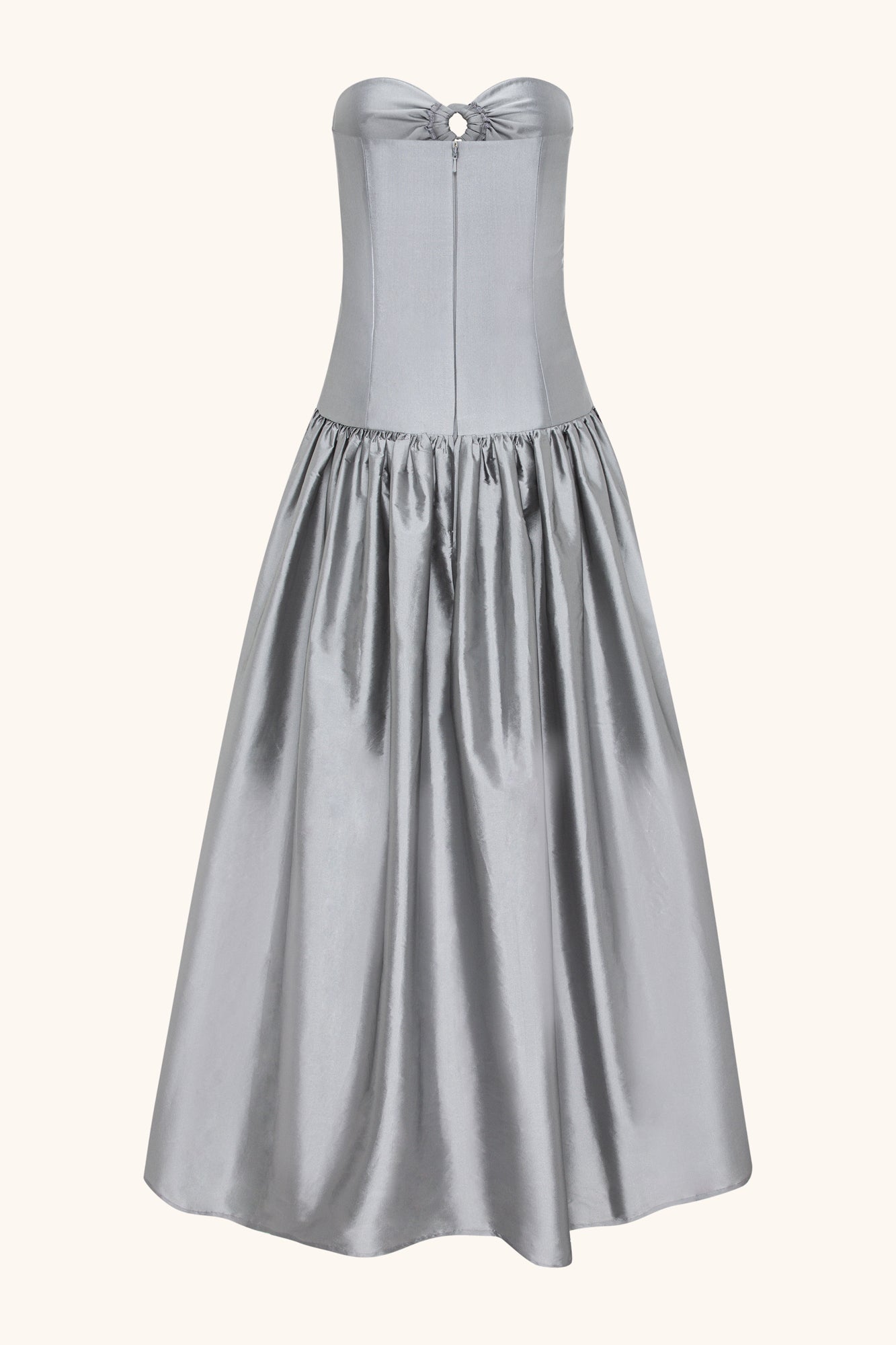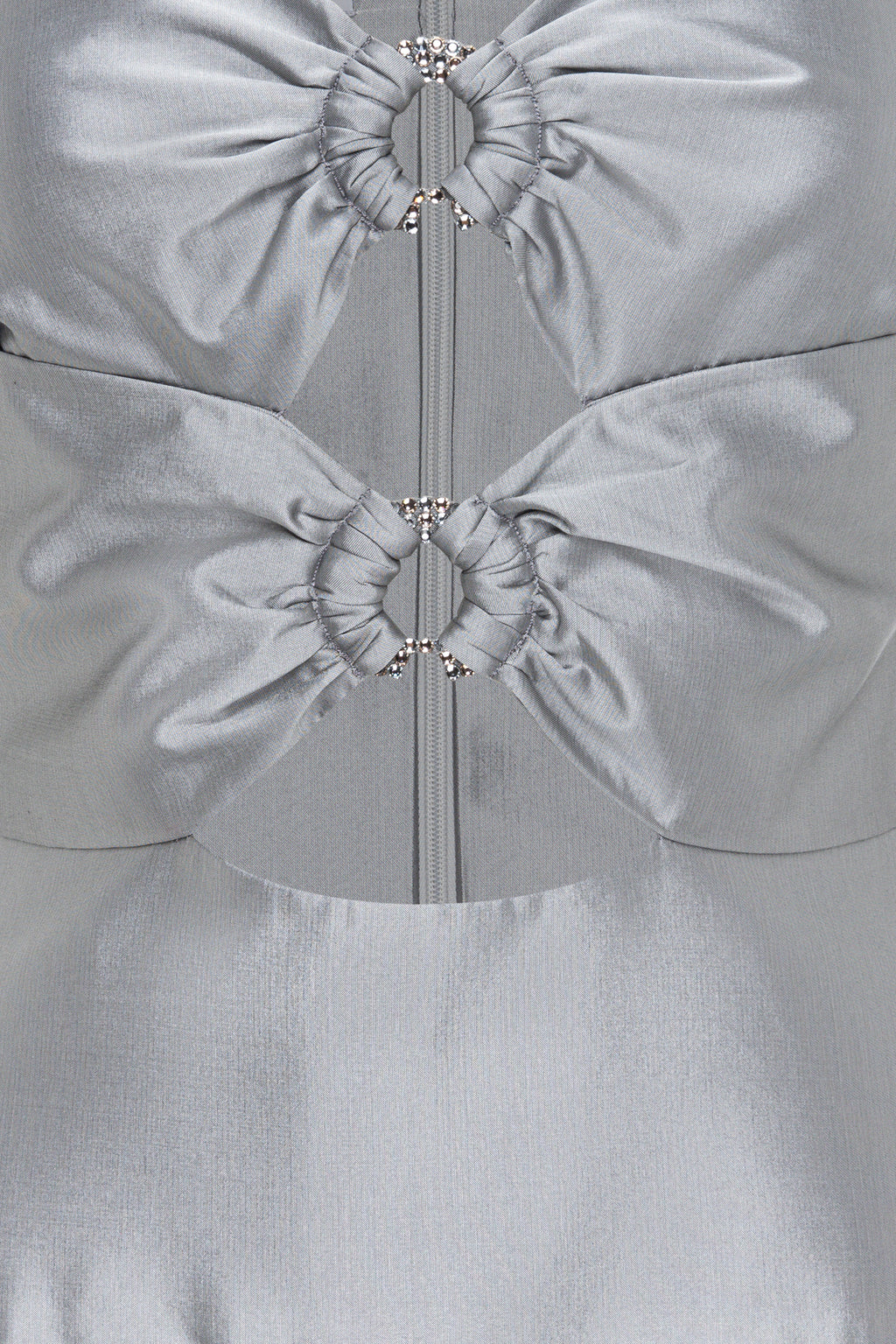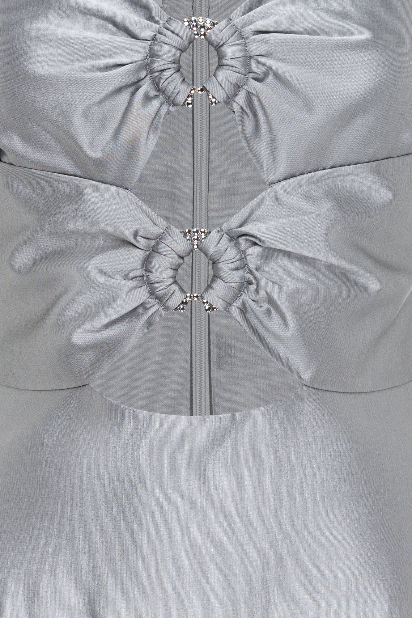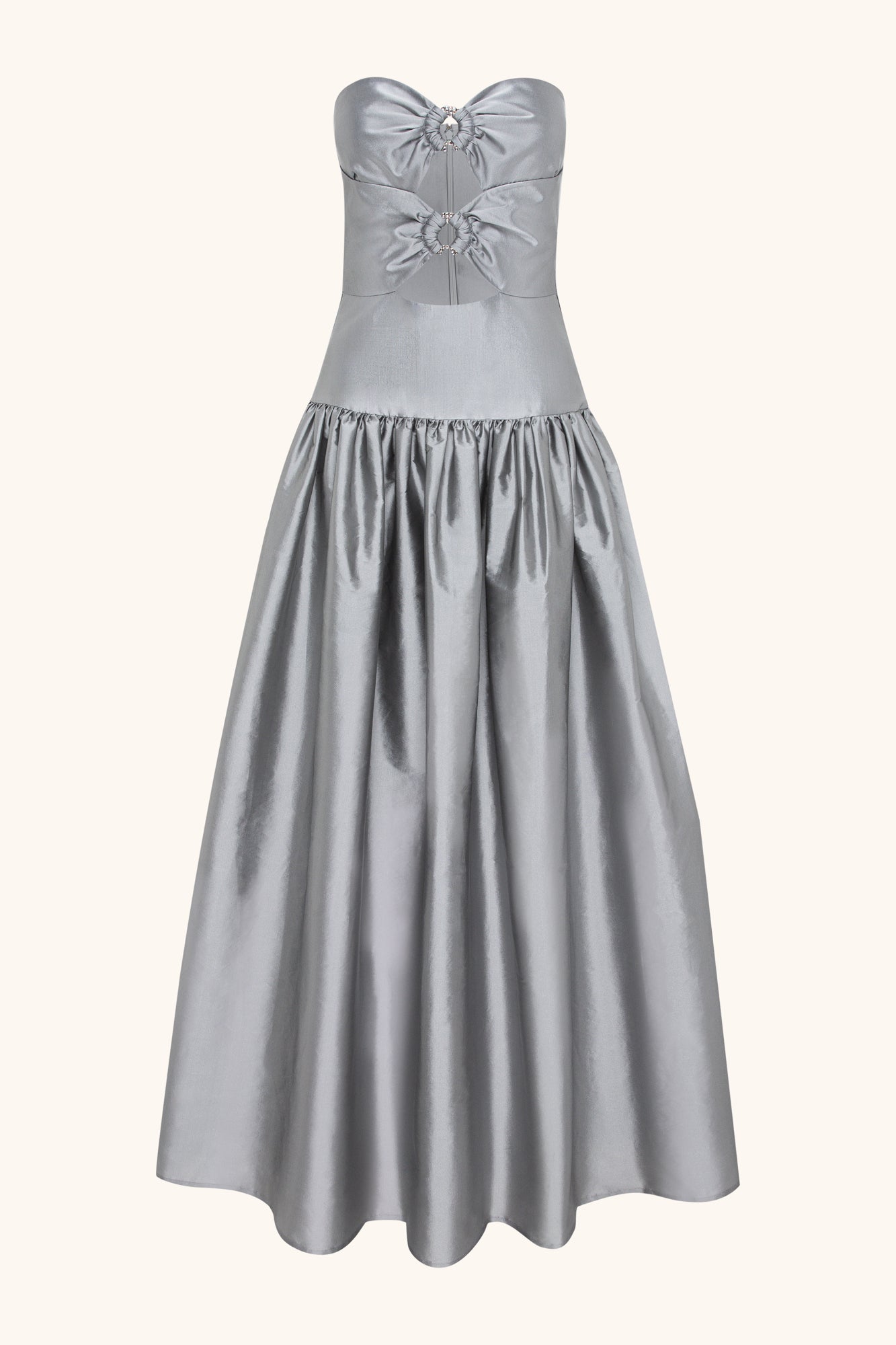Crafted from high-quality silk taffeta, this piece features a fitted bodice with cut-out details highlighted by Swarovski crystal rings.