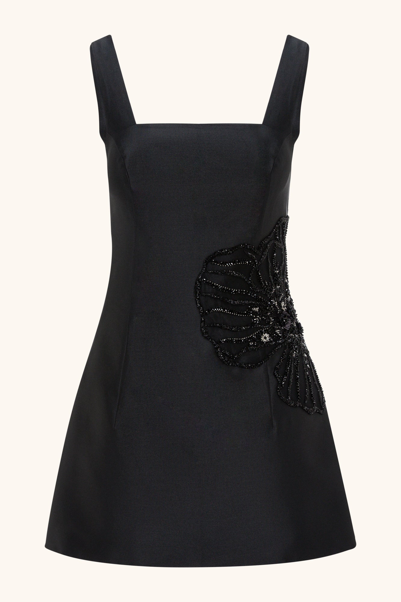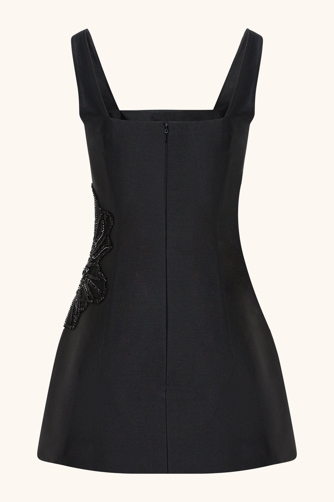 A squared neckline hourglass mini dress made from high-quality taffeta silk, featuring intricate handmade embroidery.
