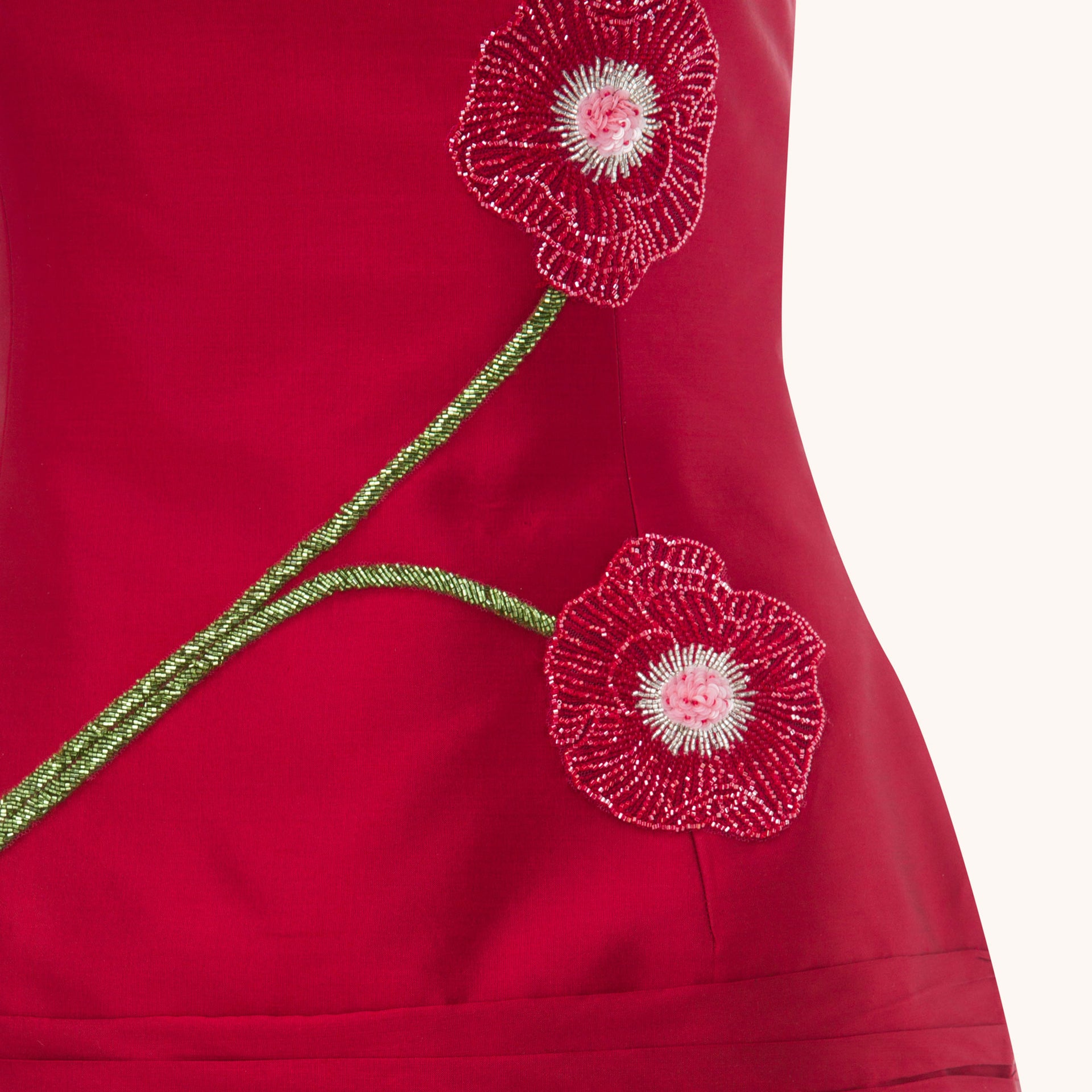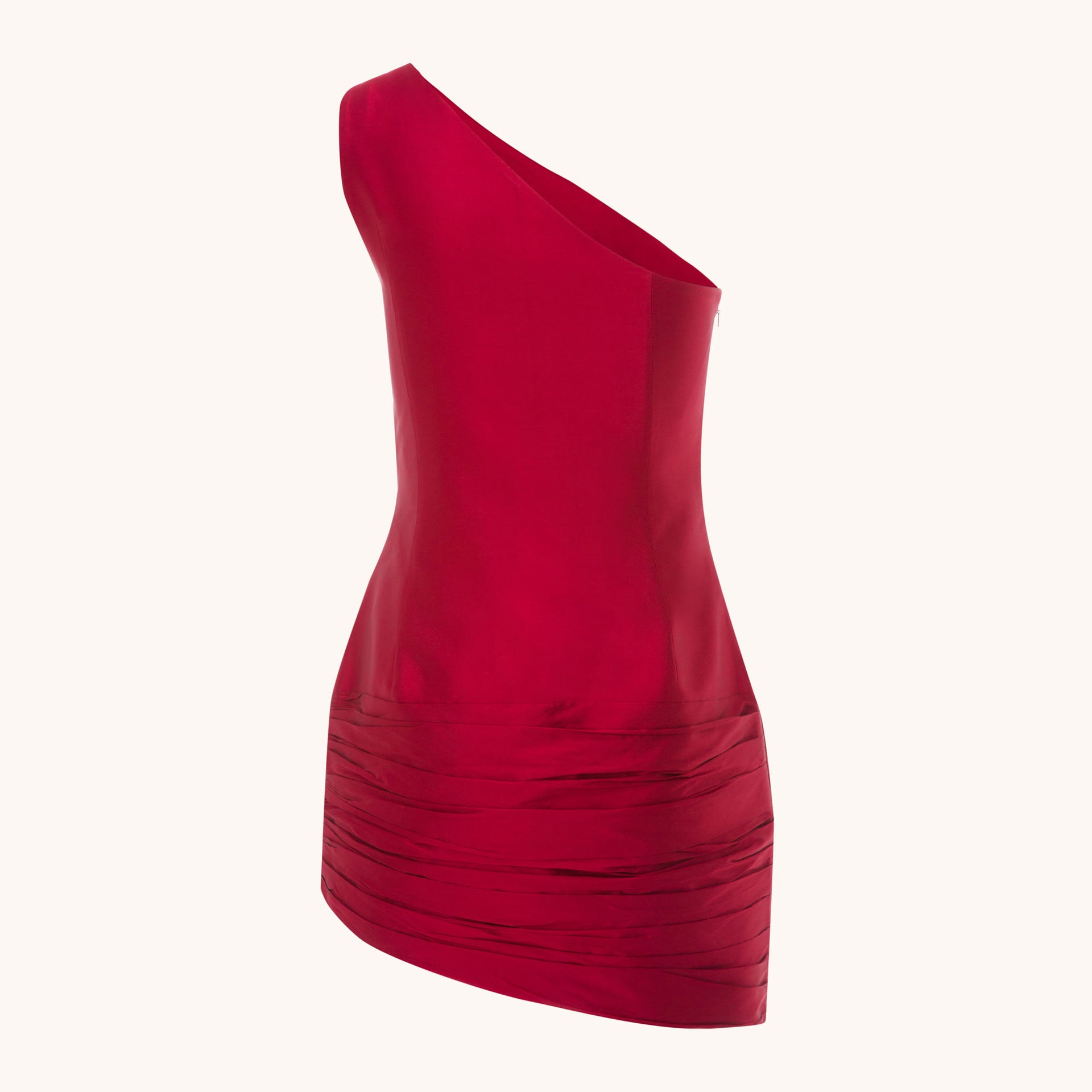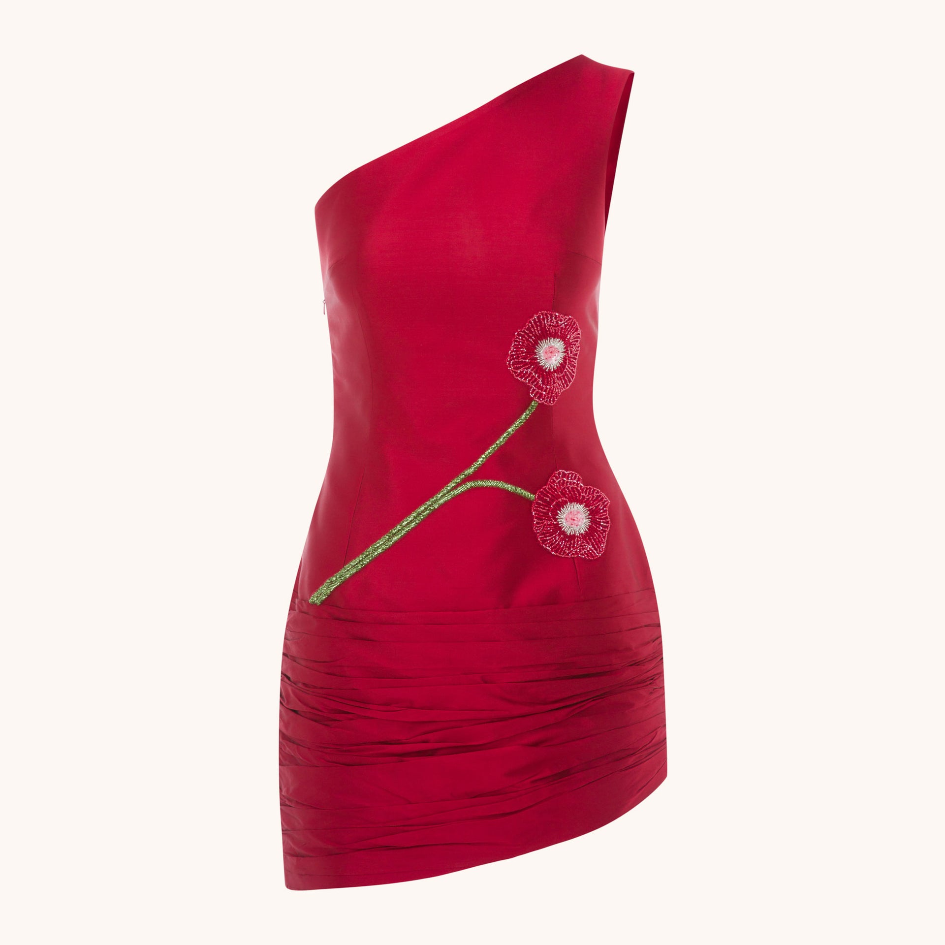 A striking asymmetric neckline dress made from high quality taffeta silk, detailed with handmade embroidery.