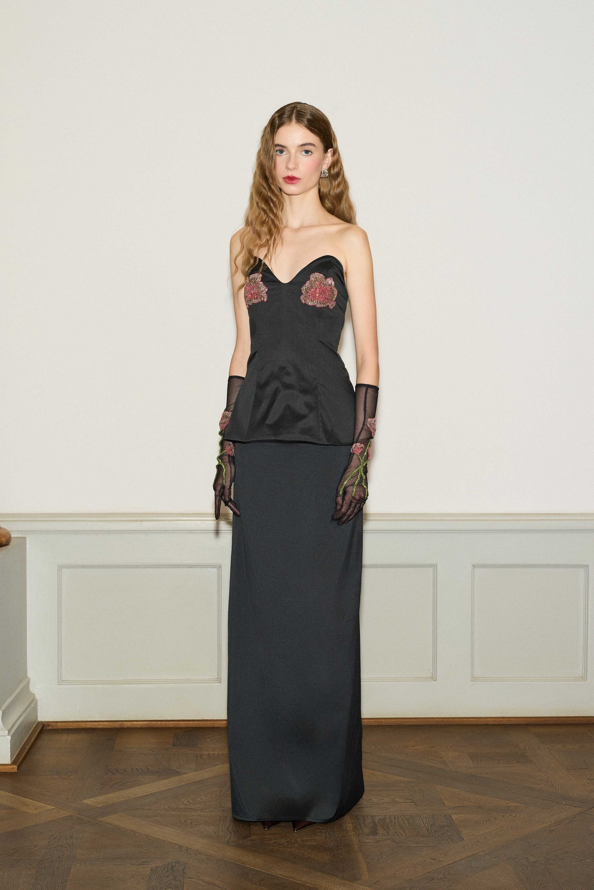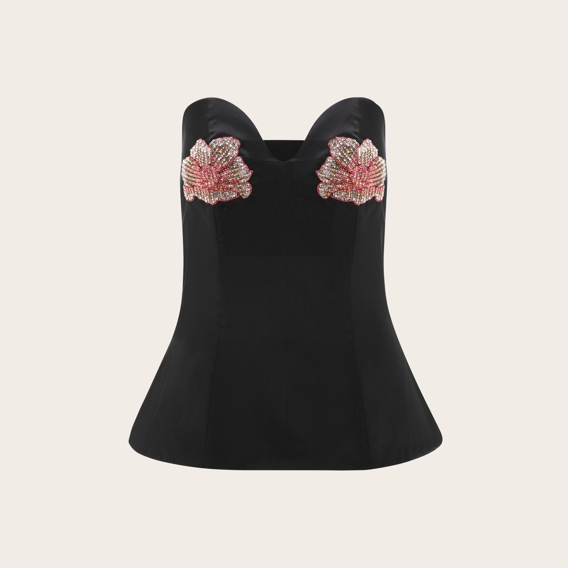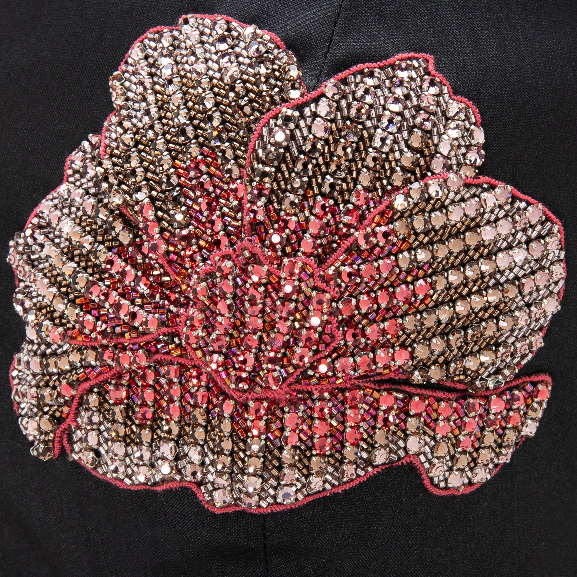 Crafted from high-quality silk taffeta, featuring intricate handmade embroidery with detailed floral designs on the front.