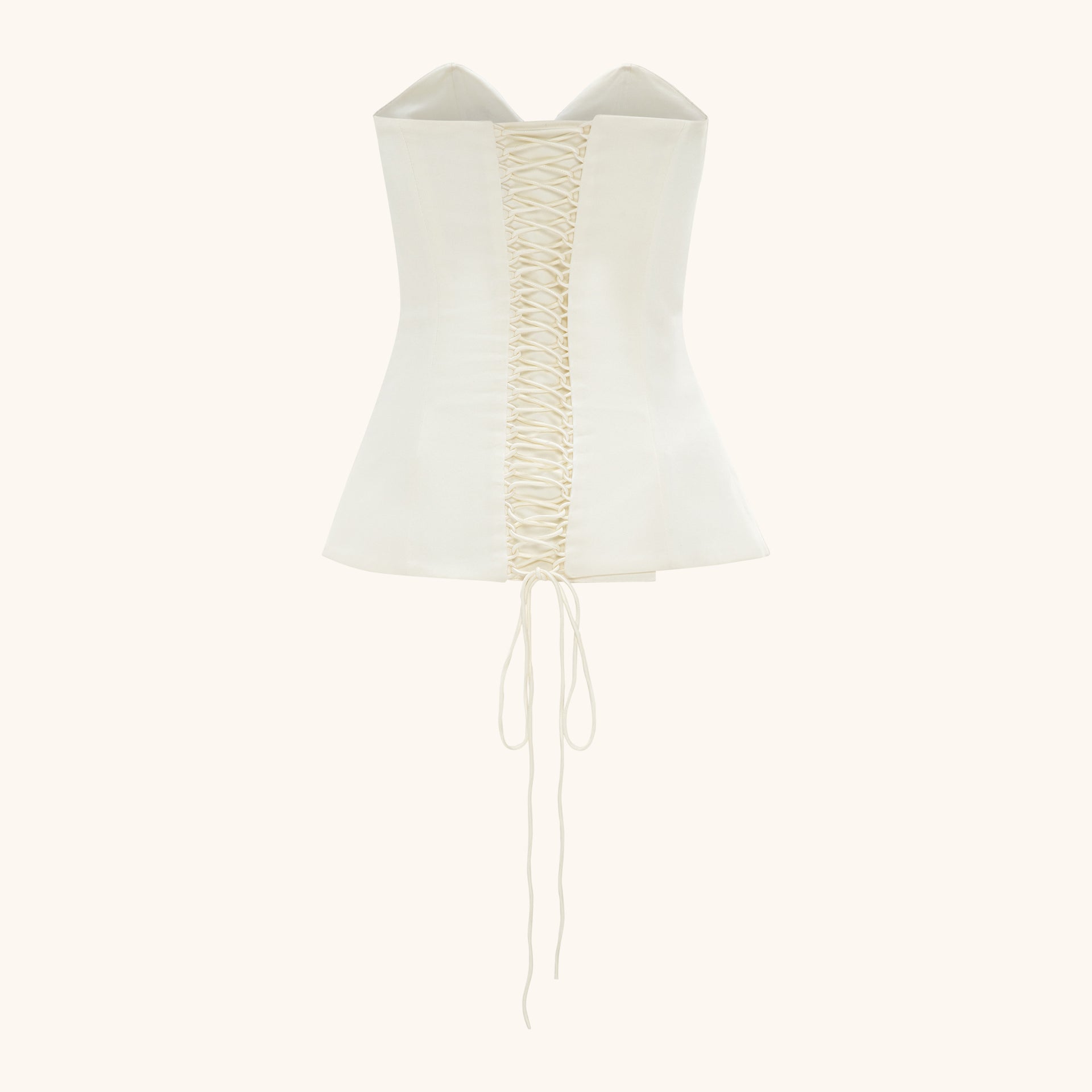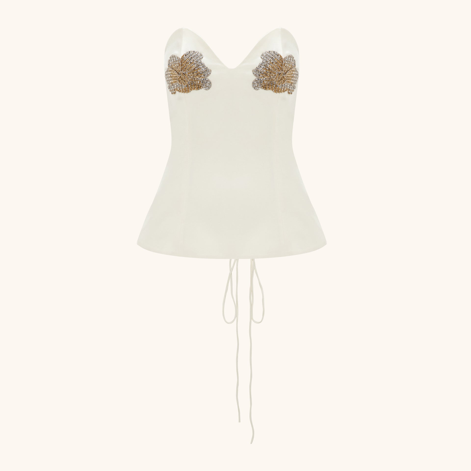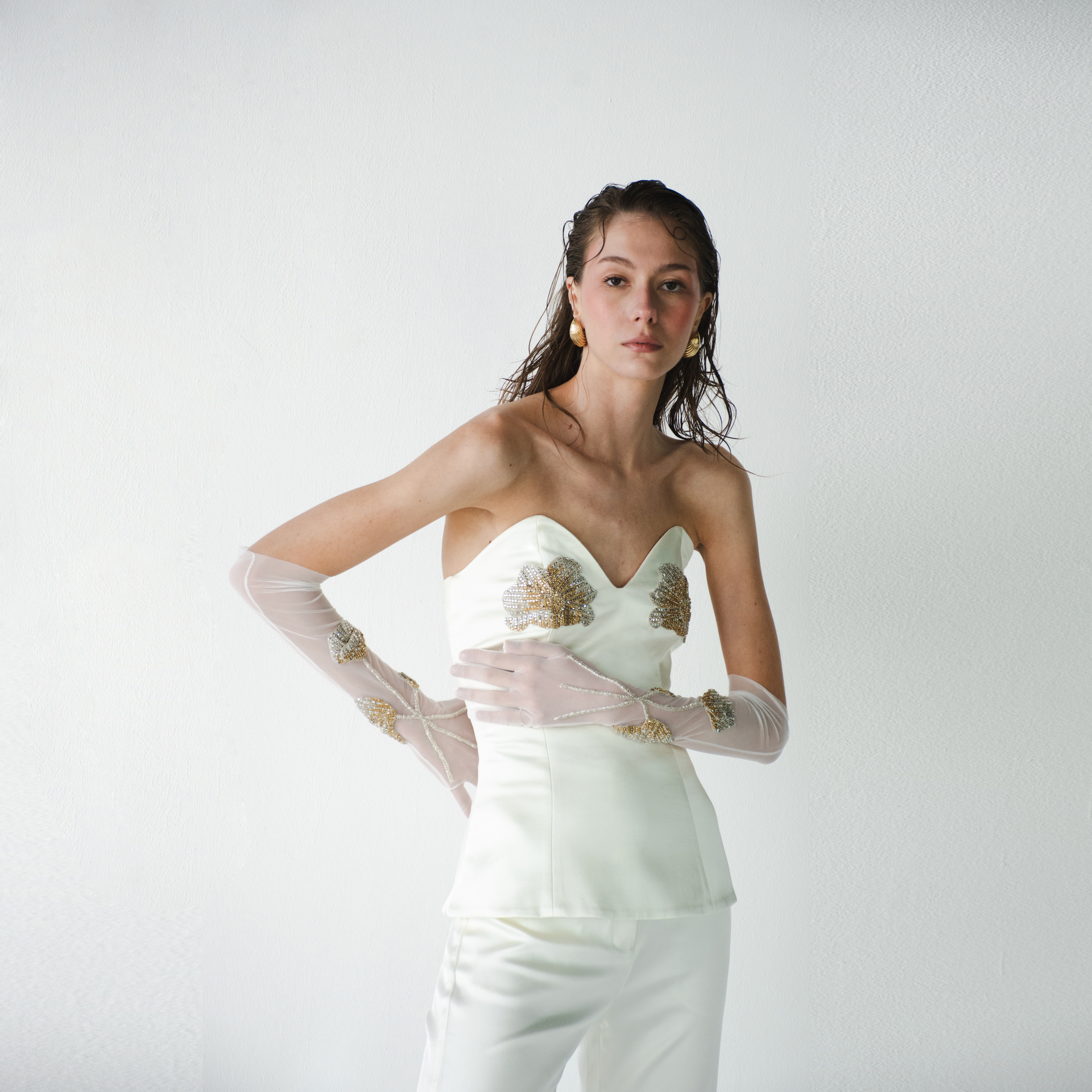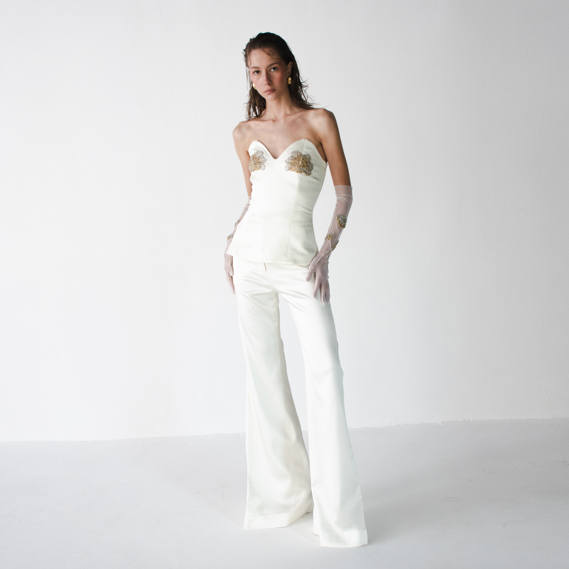 Crafted from high-quality satin, featuring intricate handmade floral embroidery on the front and an adjustable corset back.