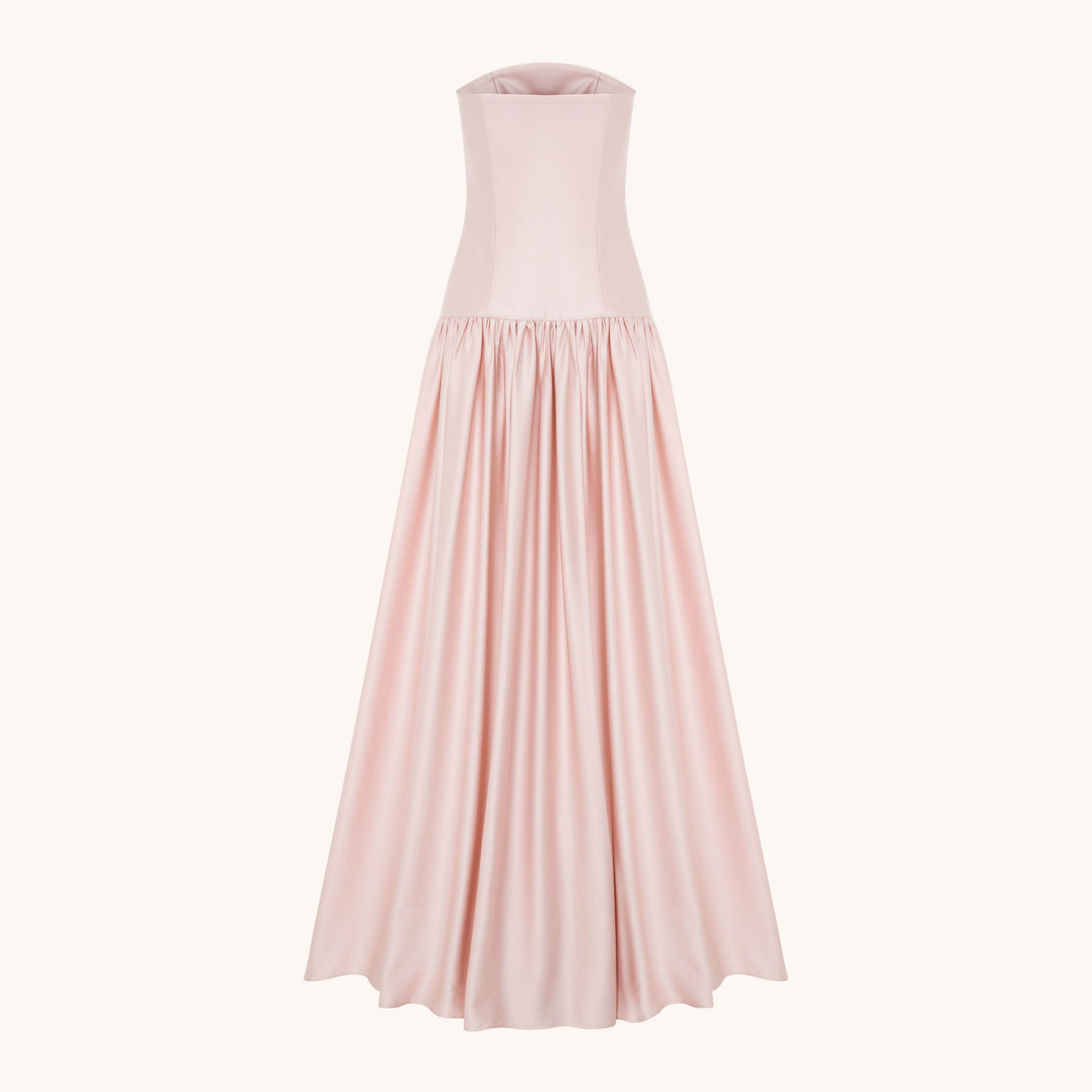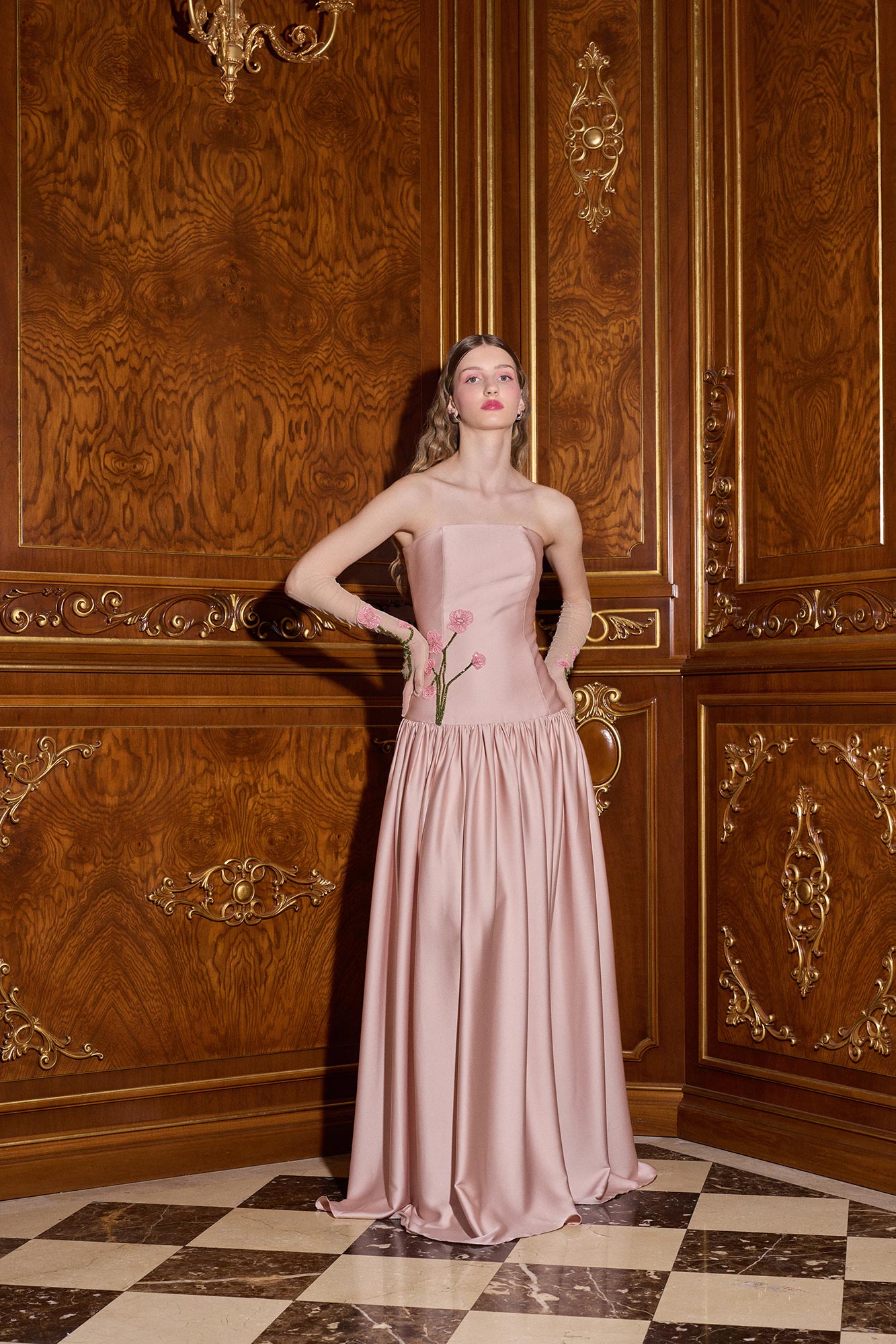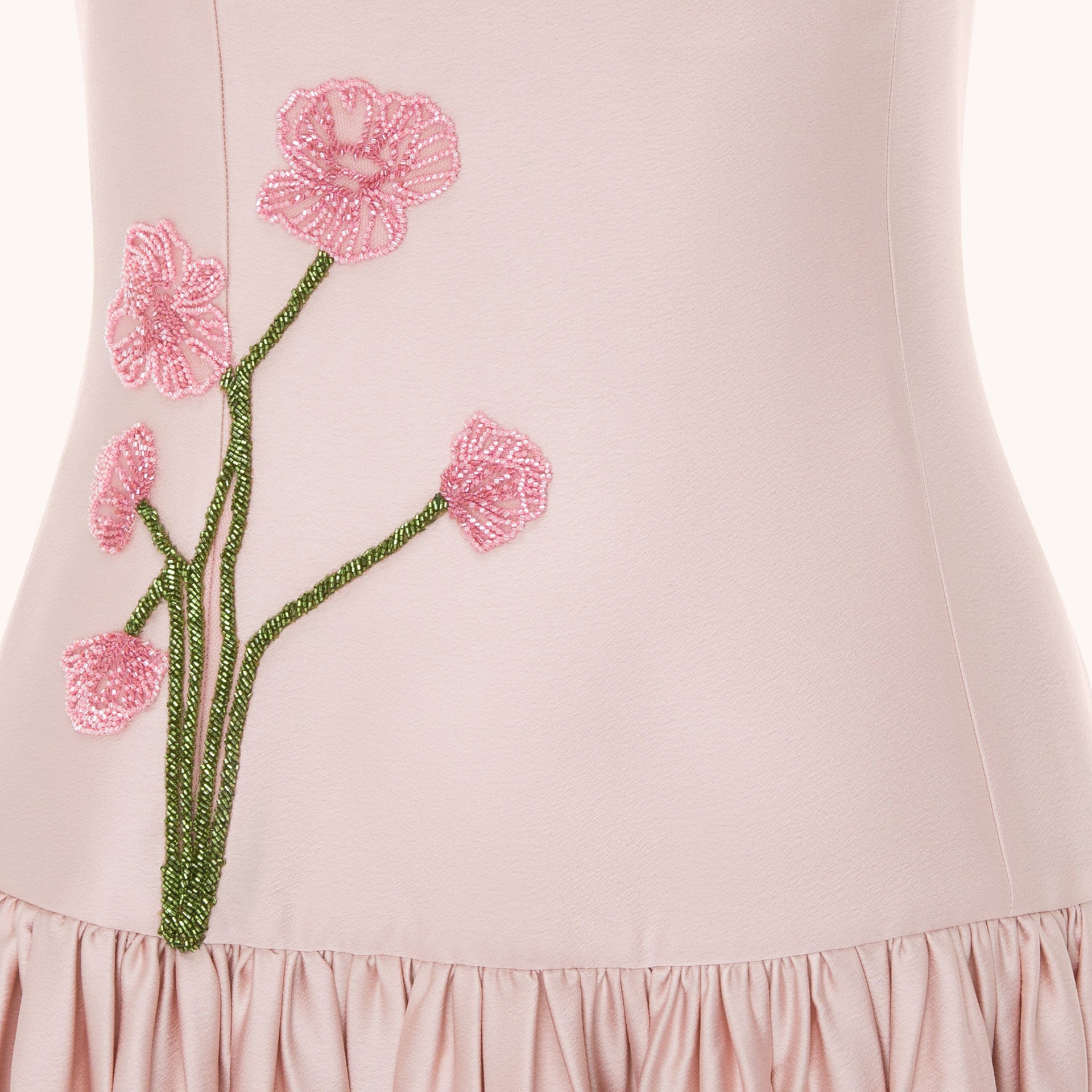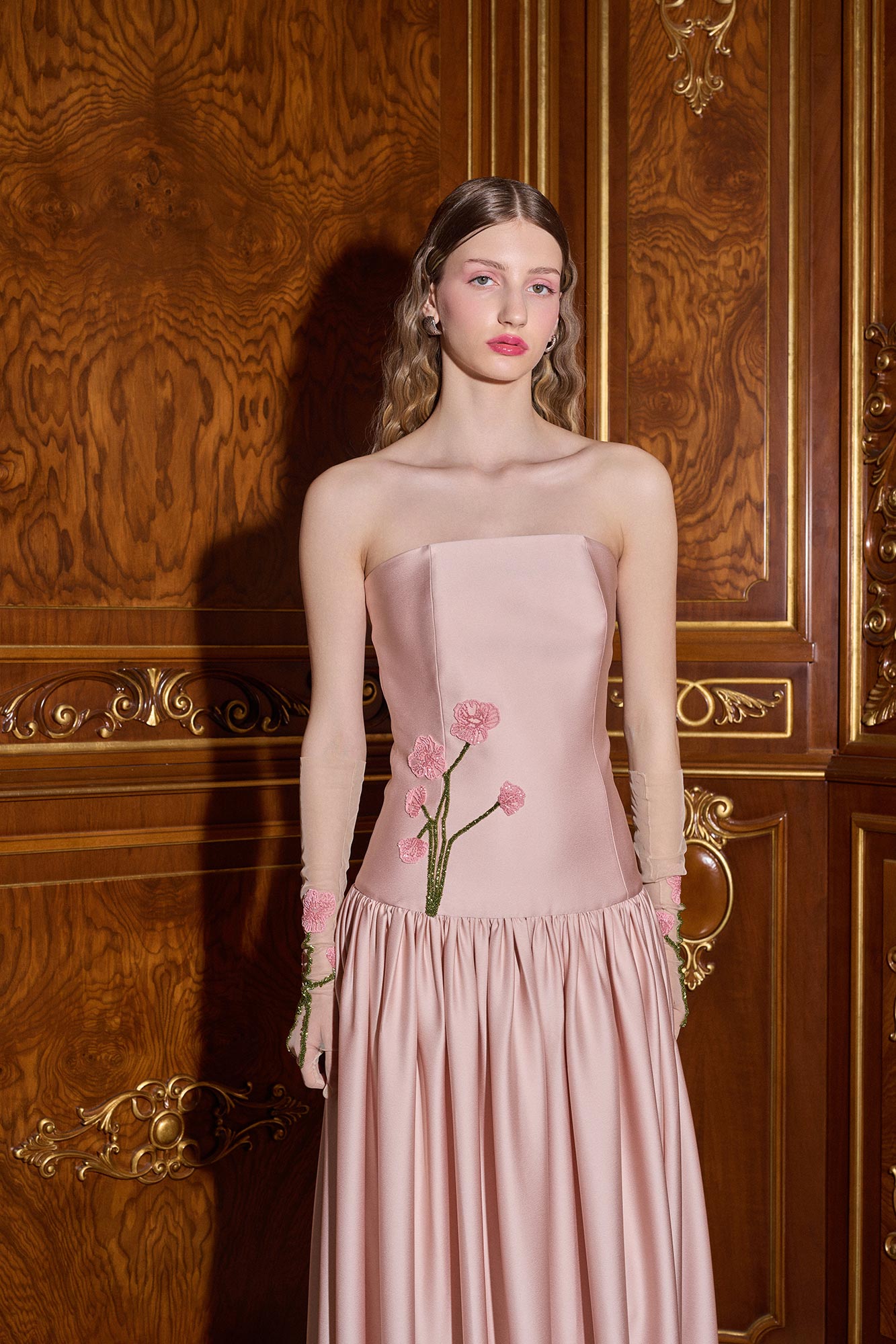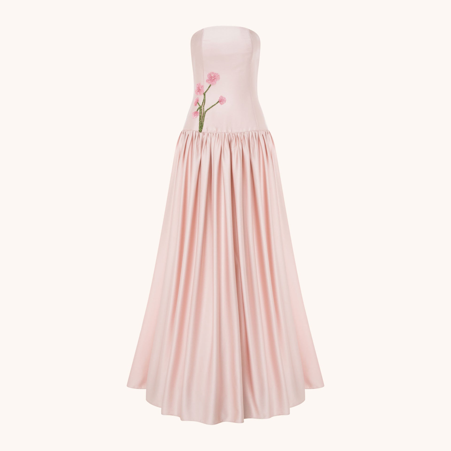 Featuring a straight across bodice with flowing skirt crafted from high-quality satin in a summer hue, adorned and intricate with handmade embroidery.