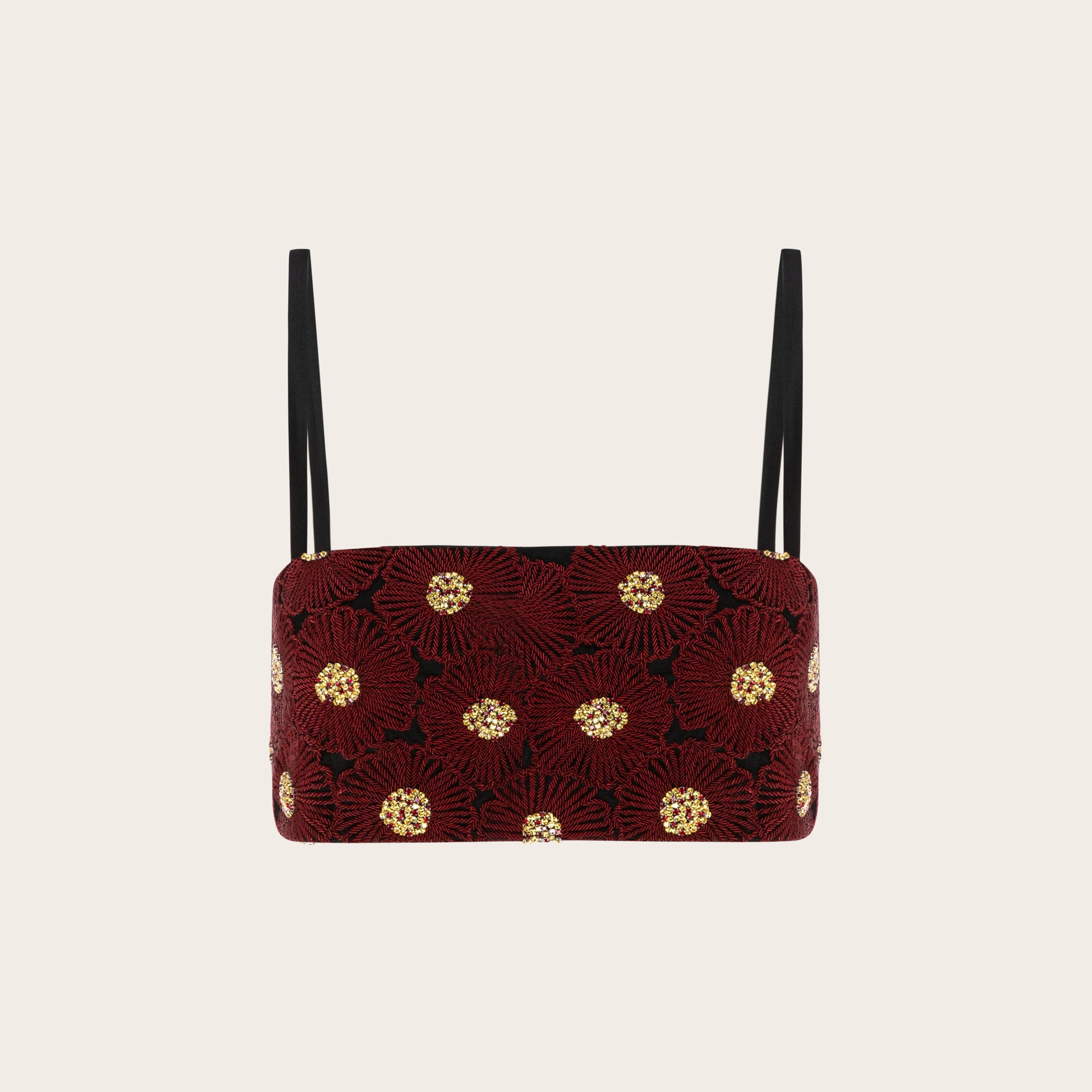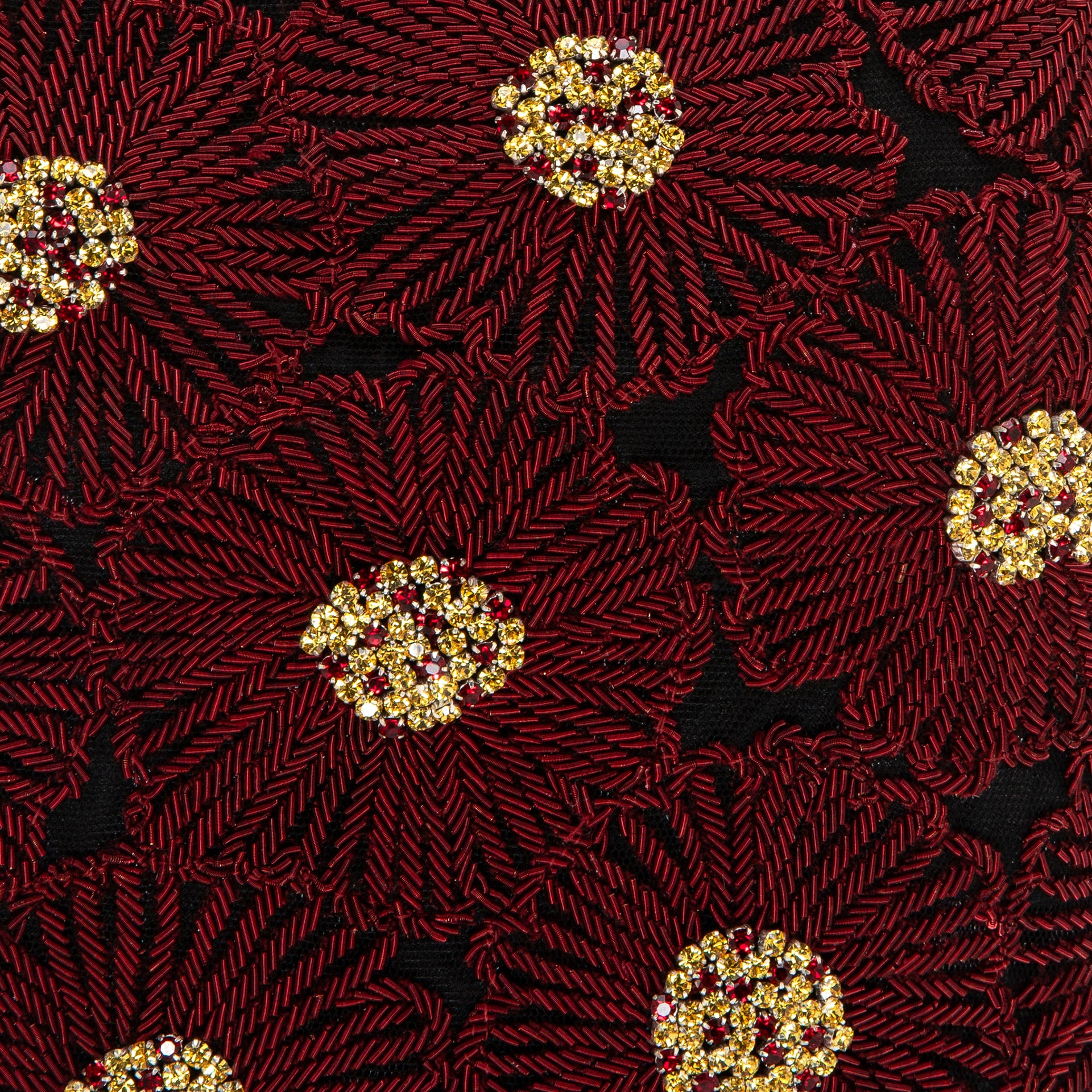 Featuring intricate beaded floral embroidery in red, complemented by simple black straps.