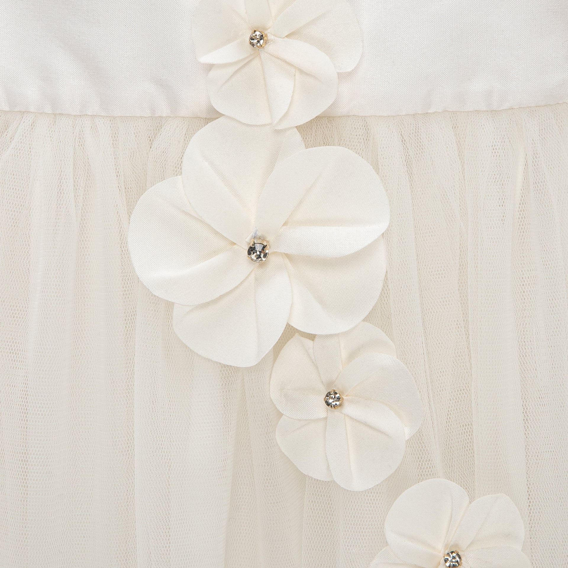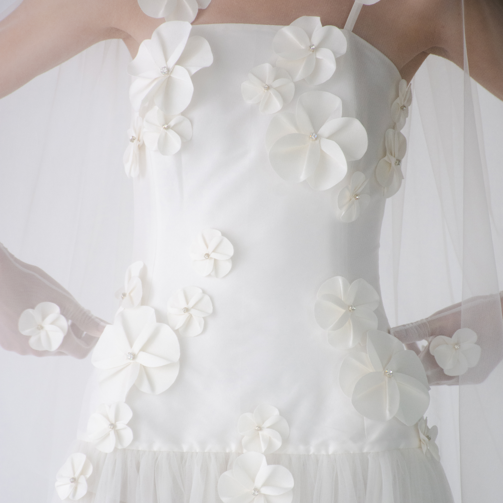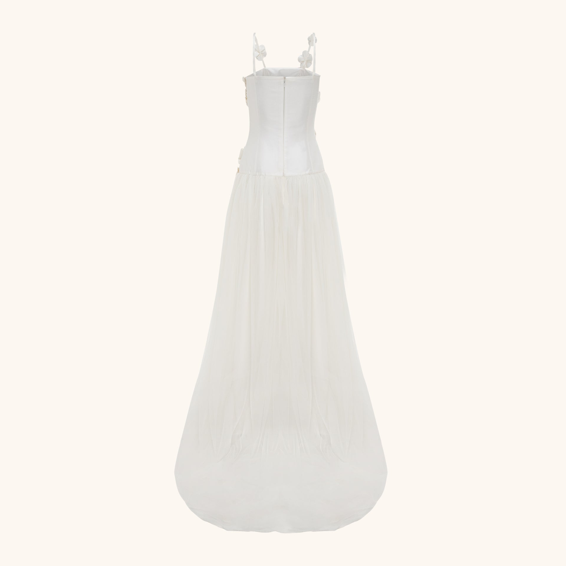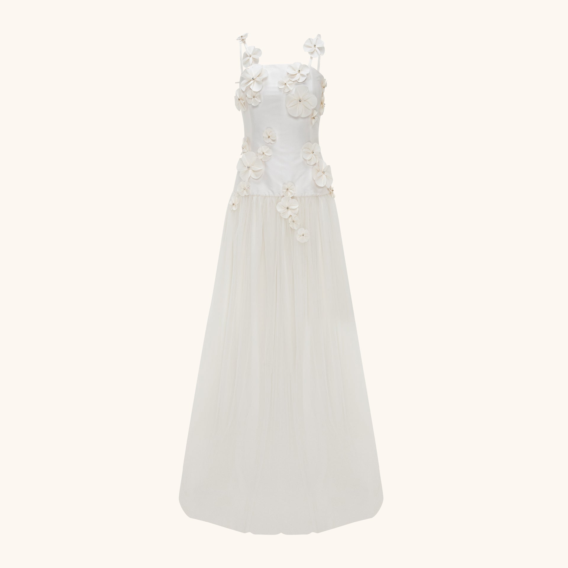 Featuring a fitted bodice with 3D floral appliqués, paired with a tulle skirt for soft, effortless movement.