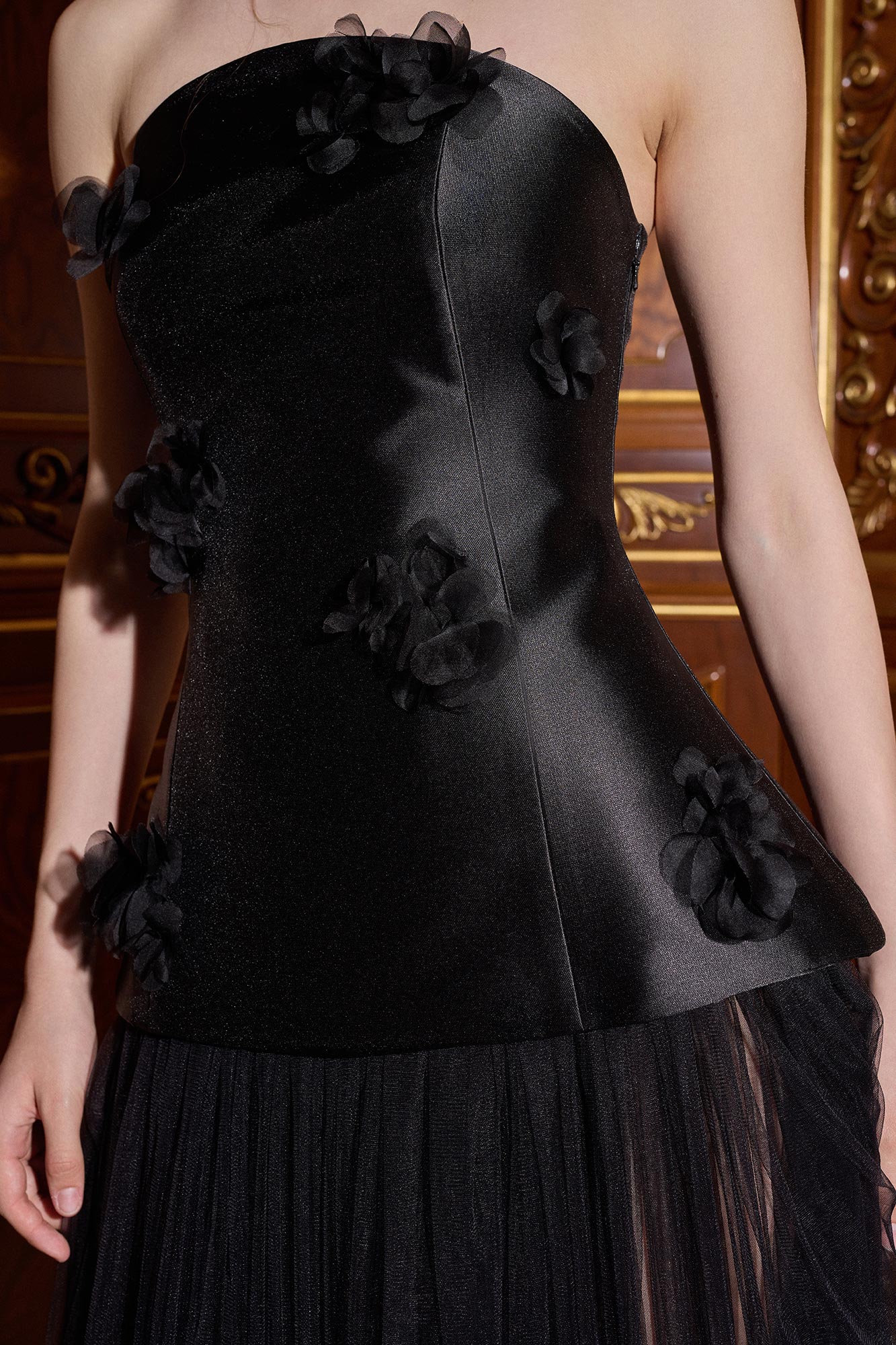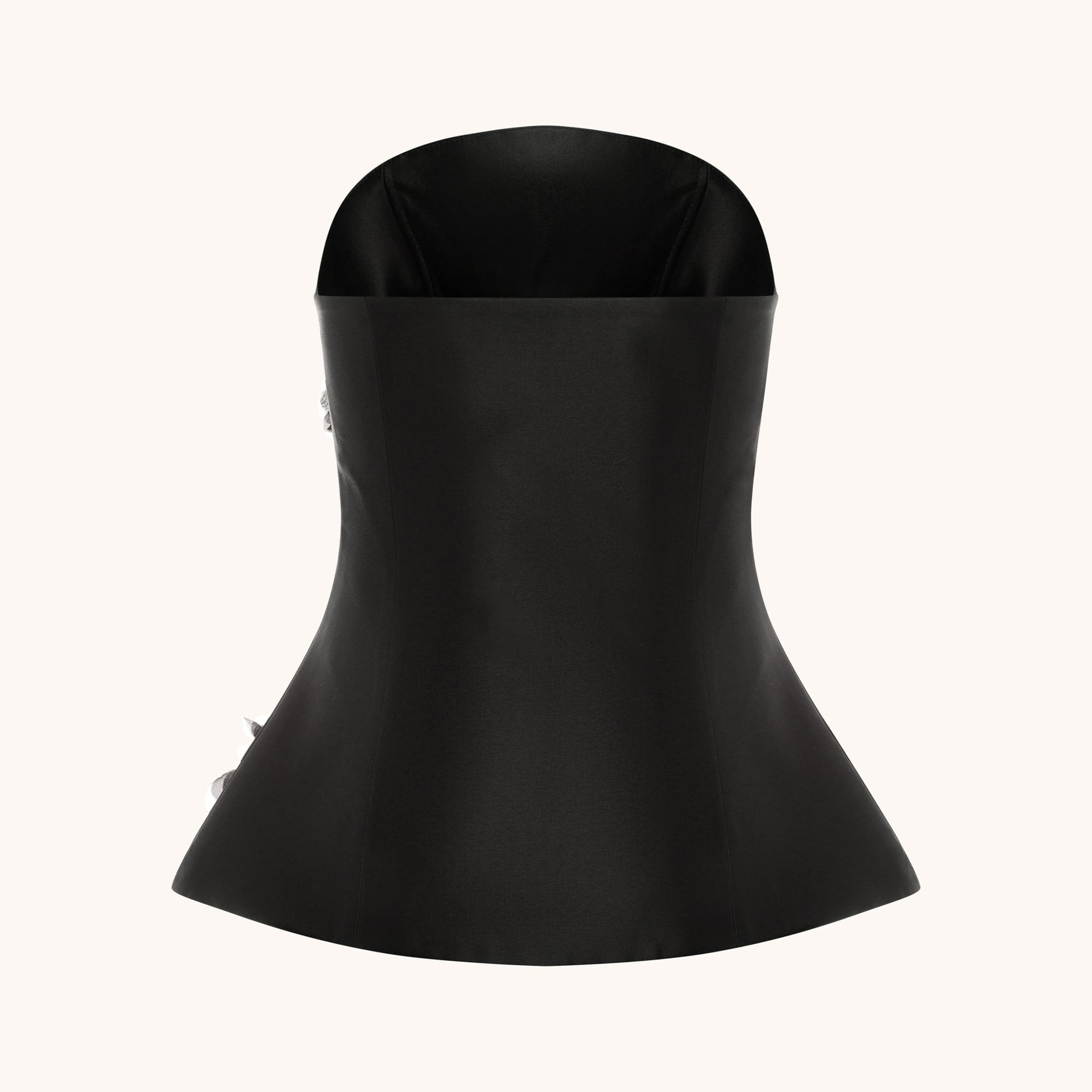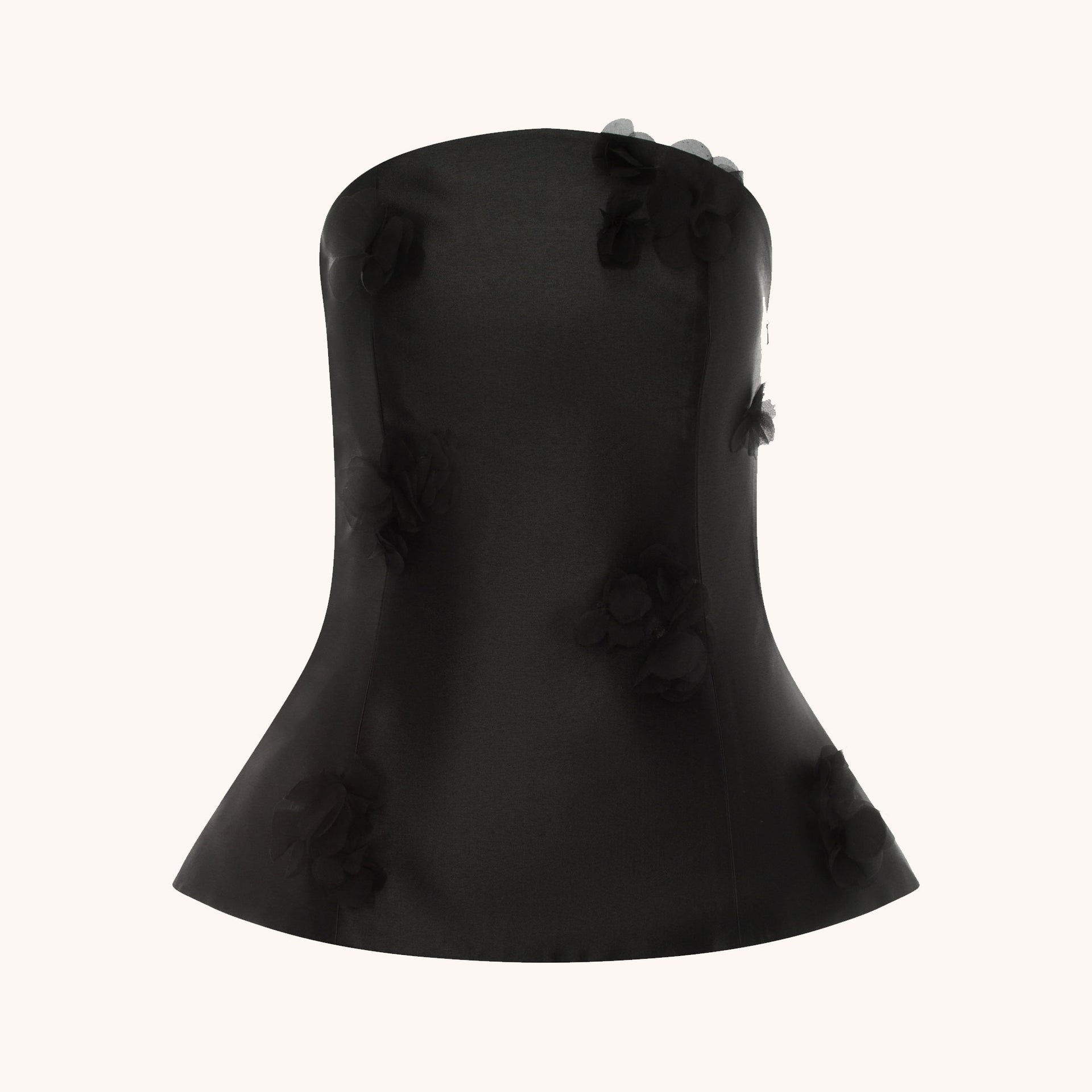 Dhs. 2,300.00A round neckline hourglass top made out of high-quality mikado, detailed with handmade flowers.