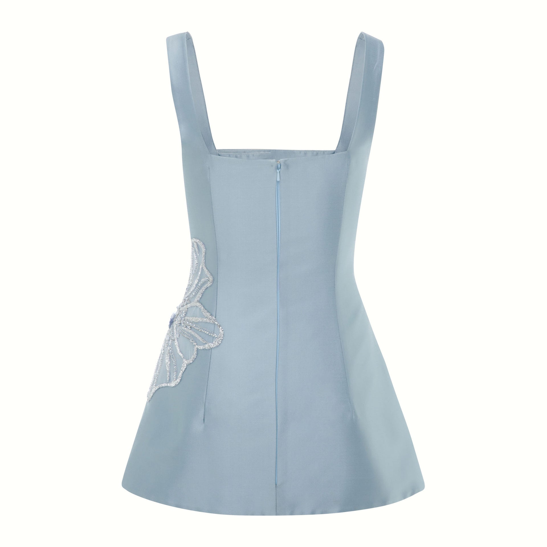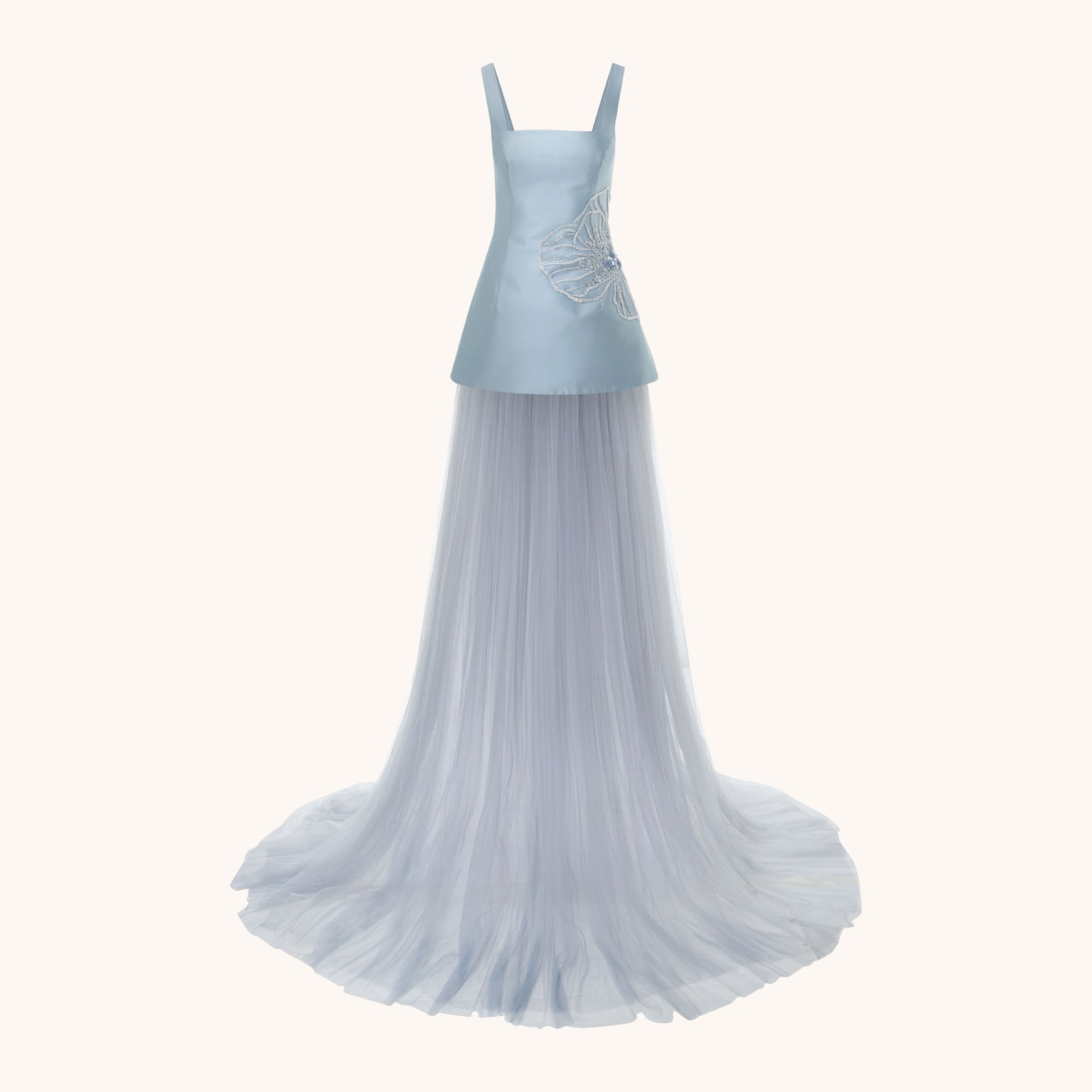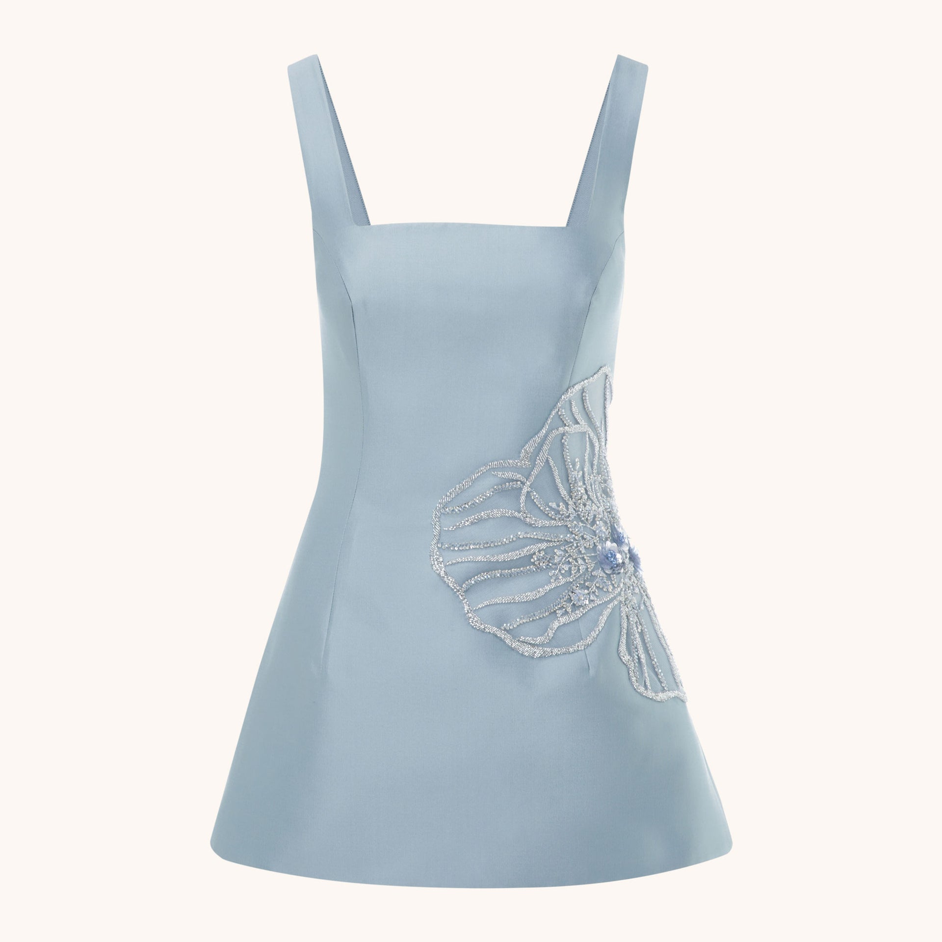 A squared neckline hourglass mini dress made from high-quality taffeta silk, featuring intricate handmade embroidery, and beautifully paired with a soft tulle skirt.