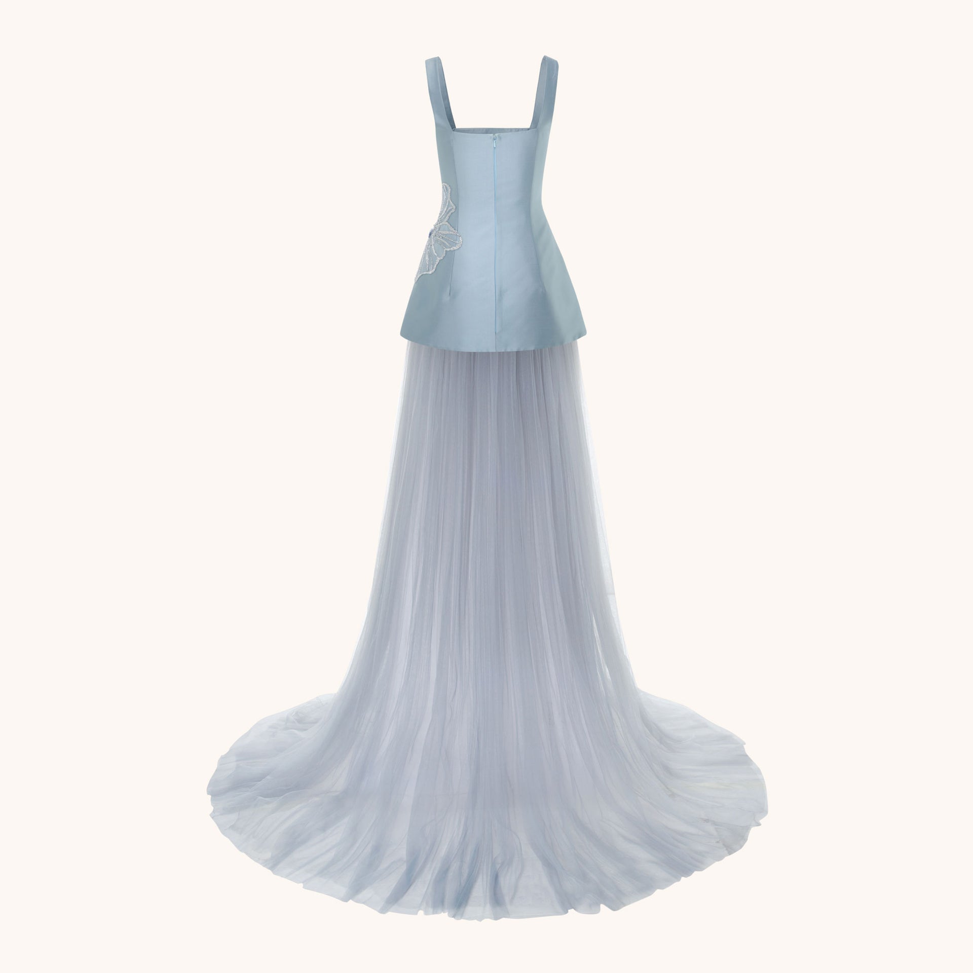Dhs. 4,300.00A squared neckline hourglass mini dress made from high-quality taffeta silk, featuring intricate handmade embroidery, and beautifully paired with a soft tulle skirt.