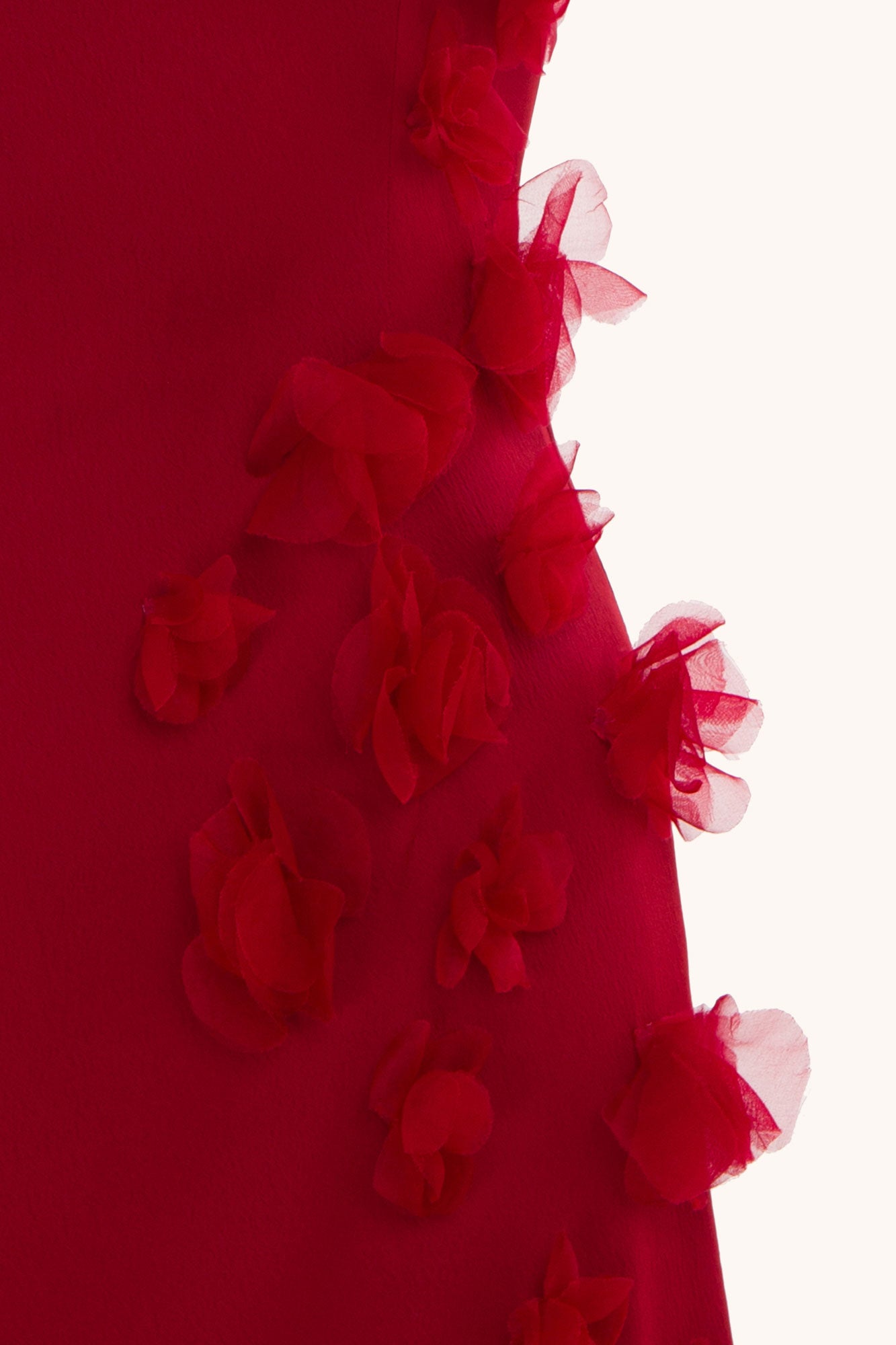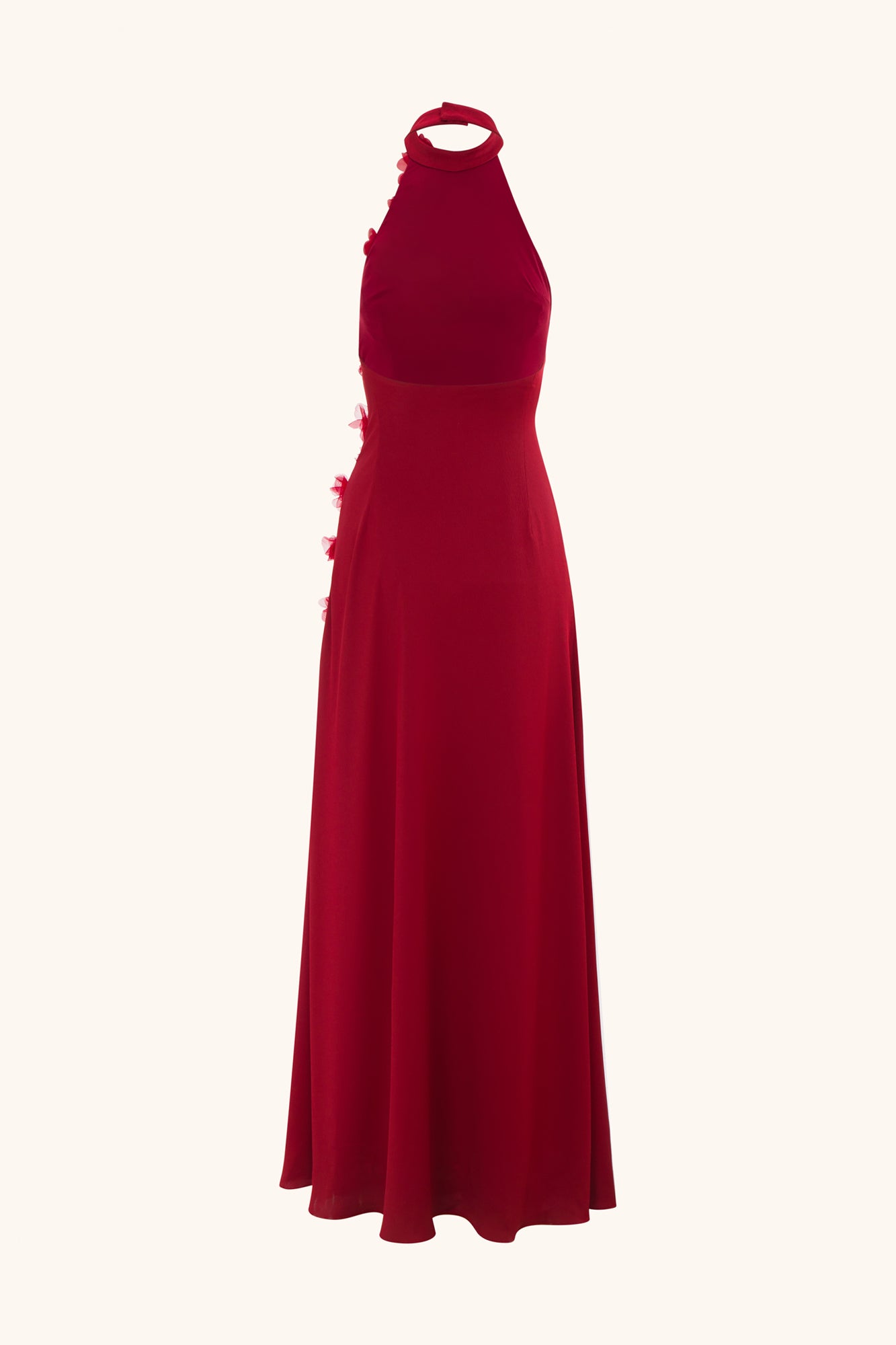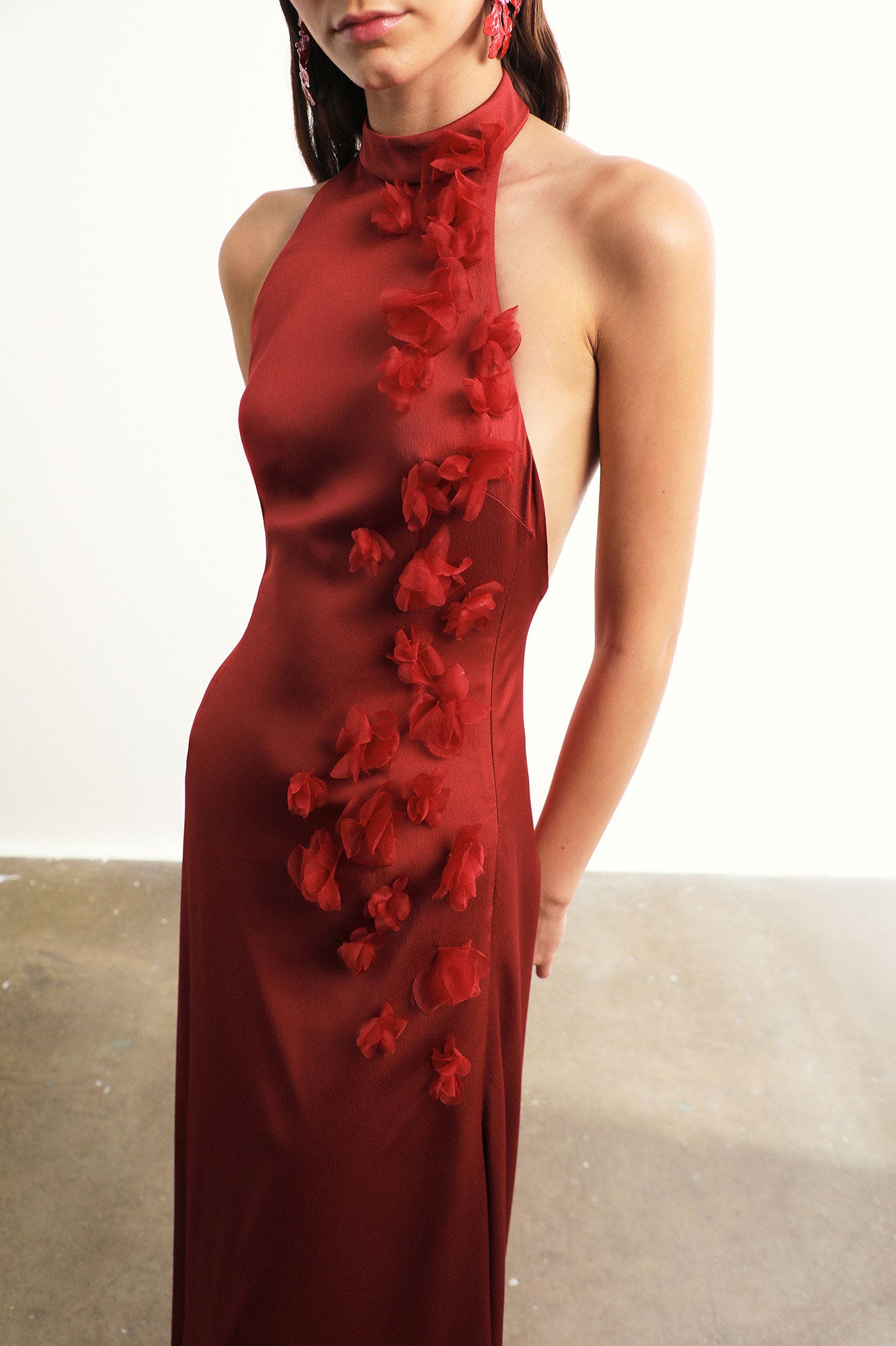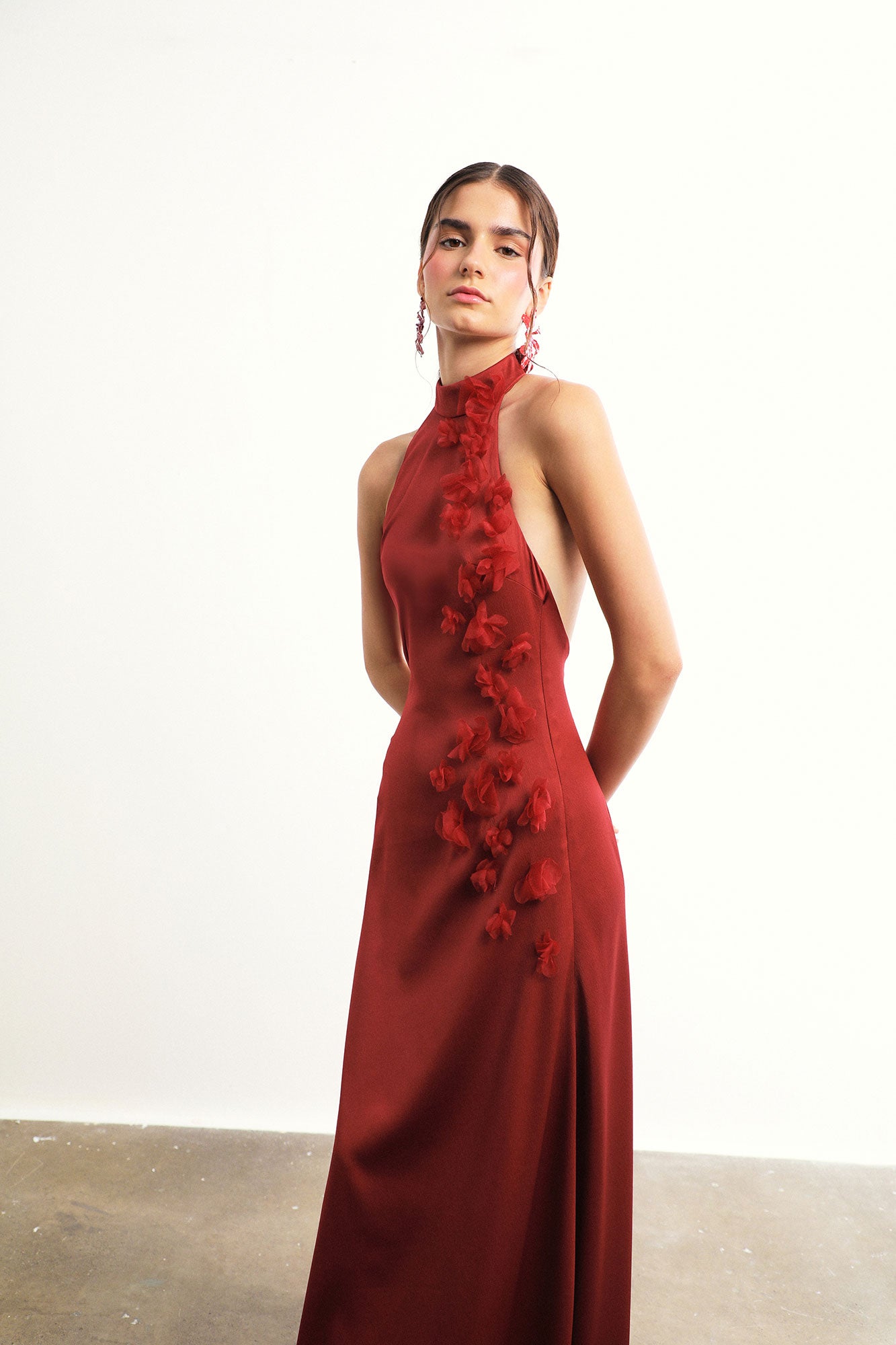 Featuring a turtle neck dress with low back design crafted from a high quality satin and detailed with handmade flowers.