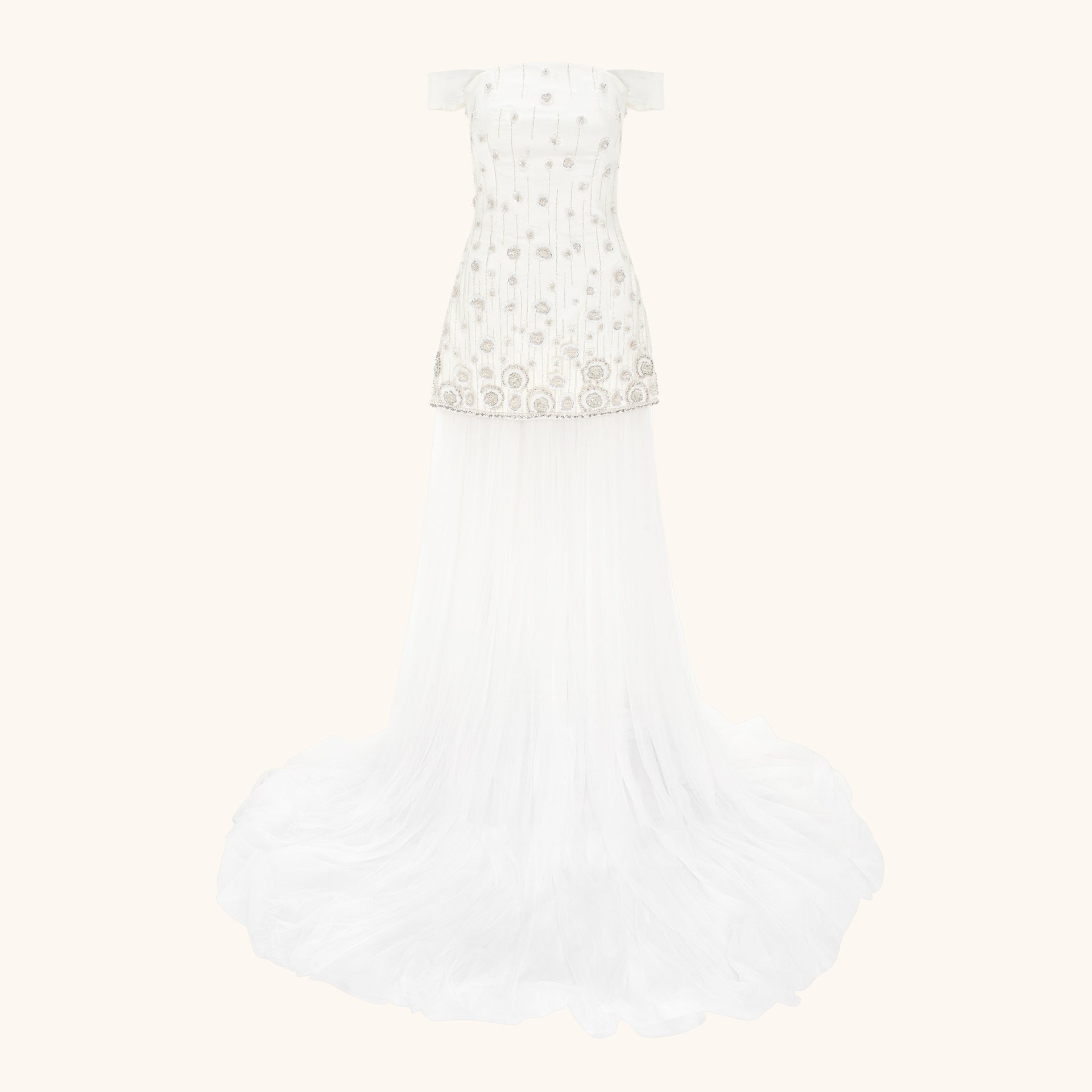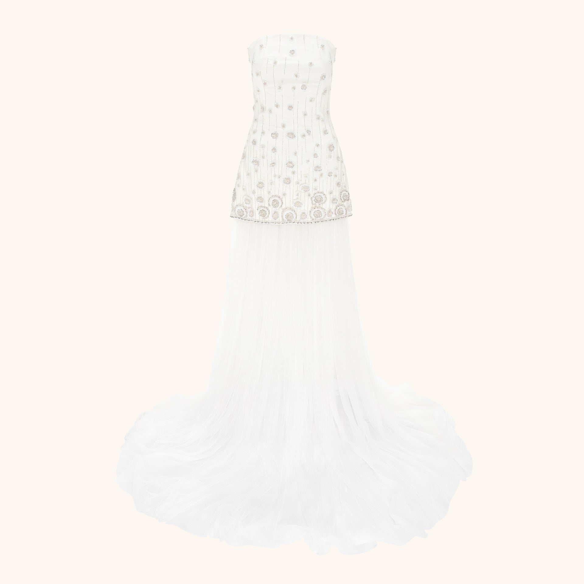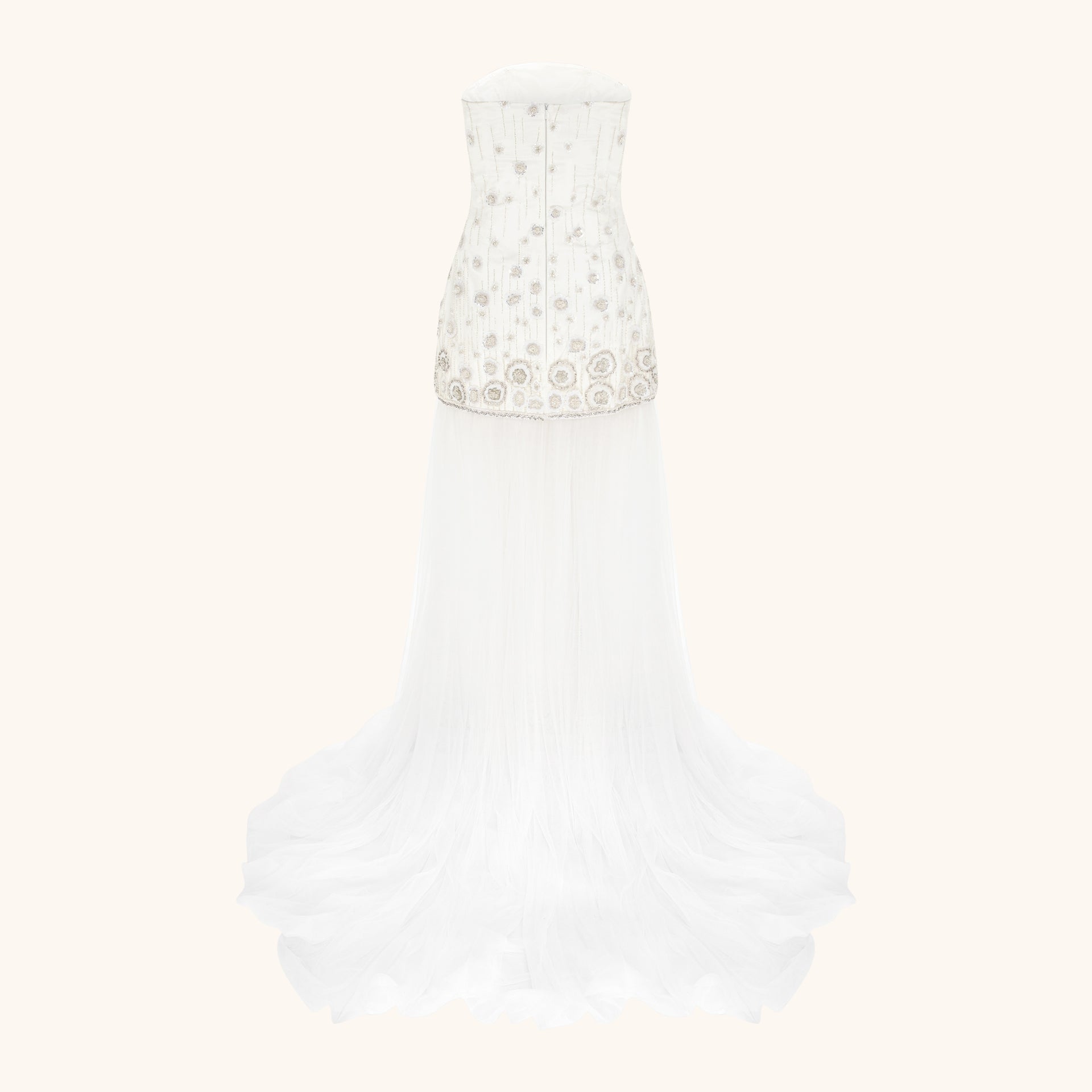 Dhs. 11,500.00A handcrafted multi-wear dress with an hourglass silhouette, featuring intricate embroidery. Designed for versatility, the modular design allows the skirt and straps to be added or removed for multiple styling options.