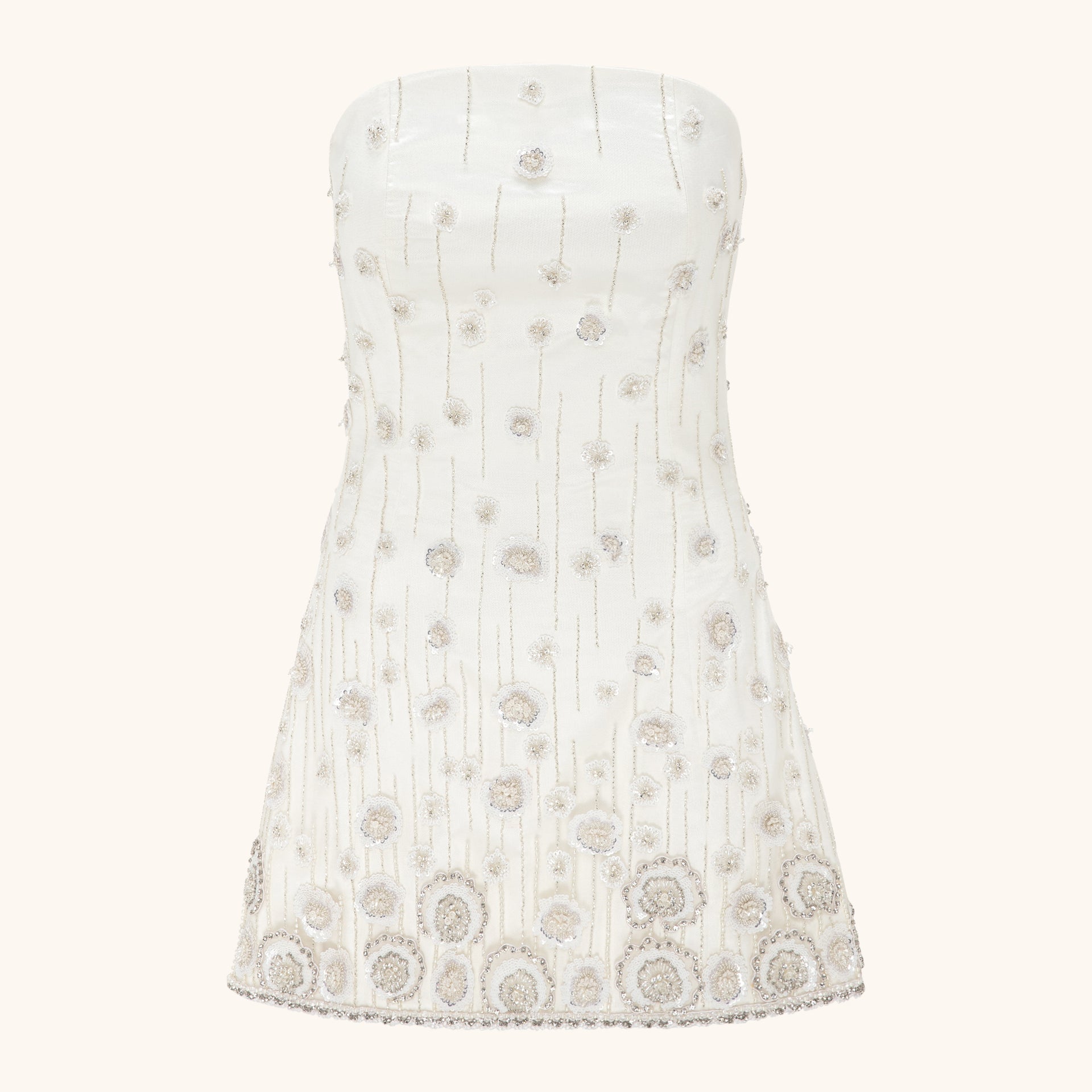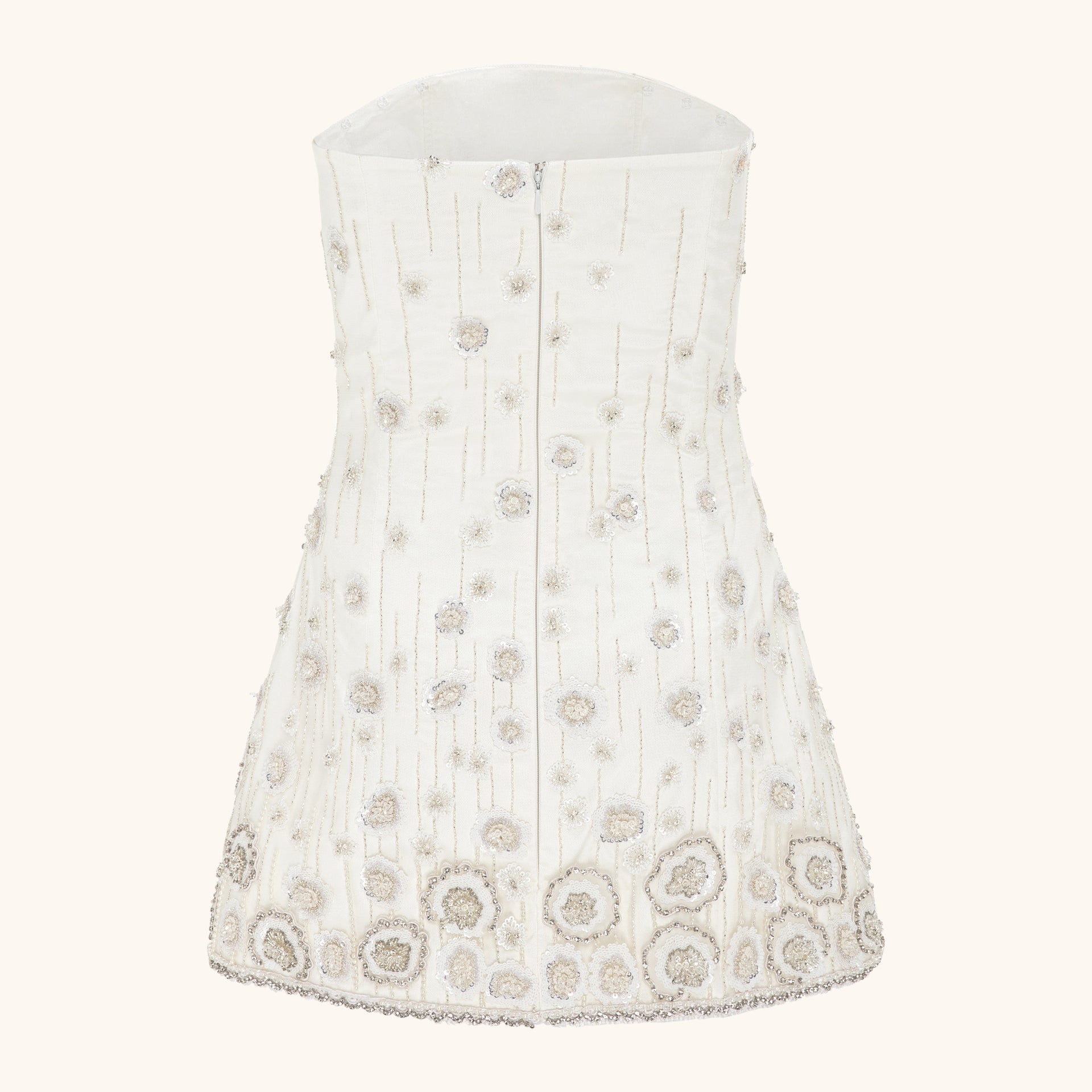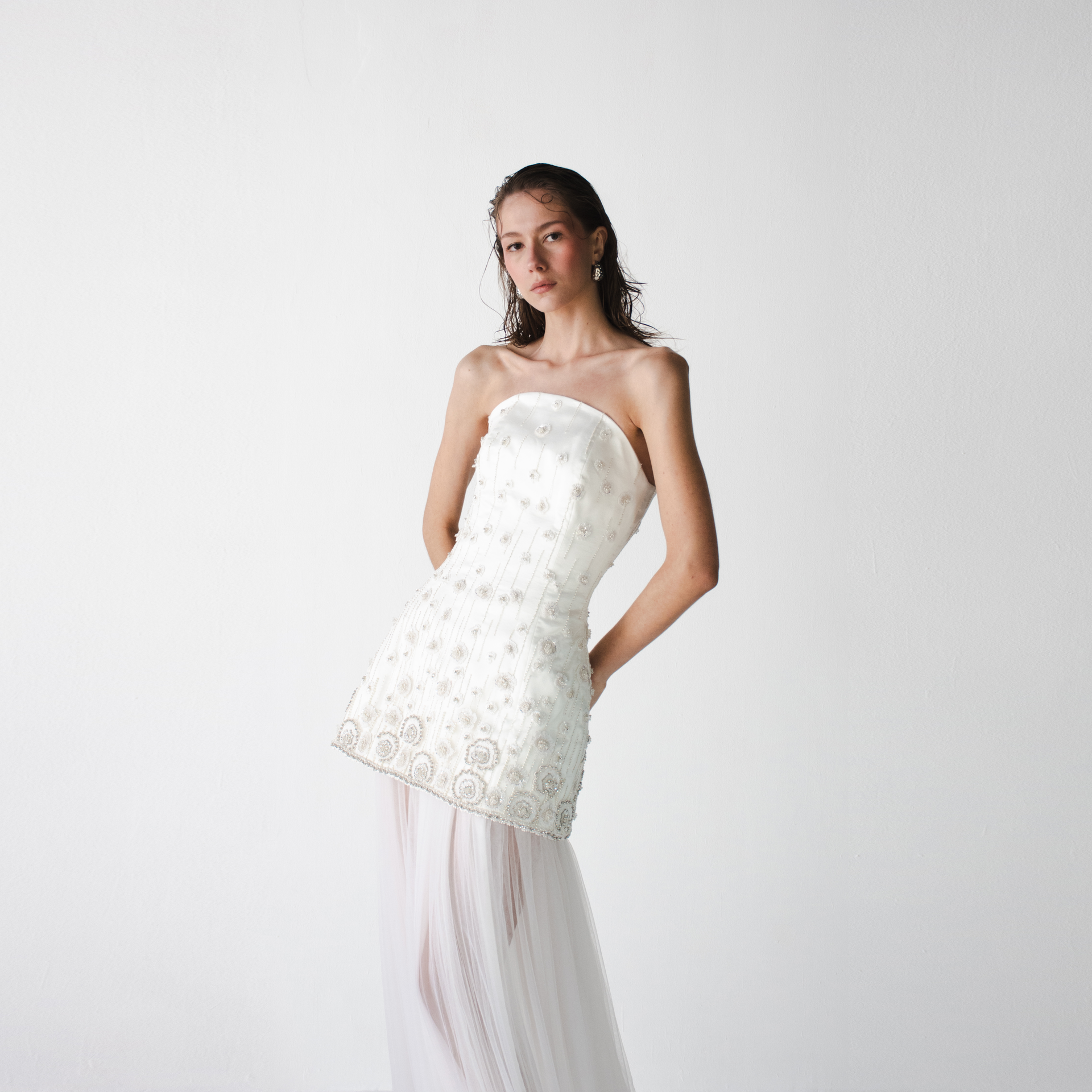 Dhs. 11,500.00A handcrafted multi-wear dress with an hourglass silhouette, featuring intricate embroidery. Designed for versatility, the modular design allows the skirt and straps to be added or removed for multiple styling options.