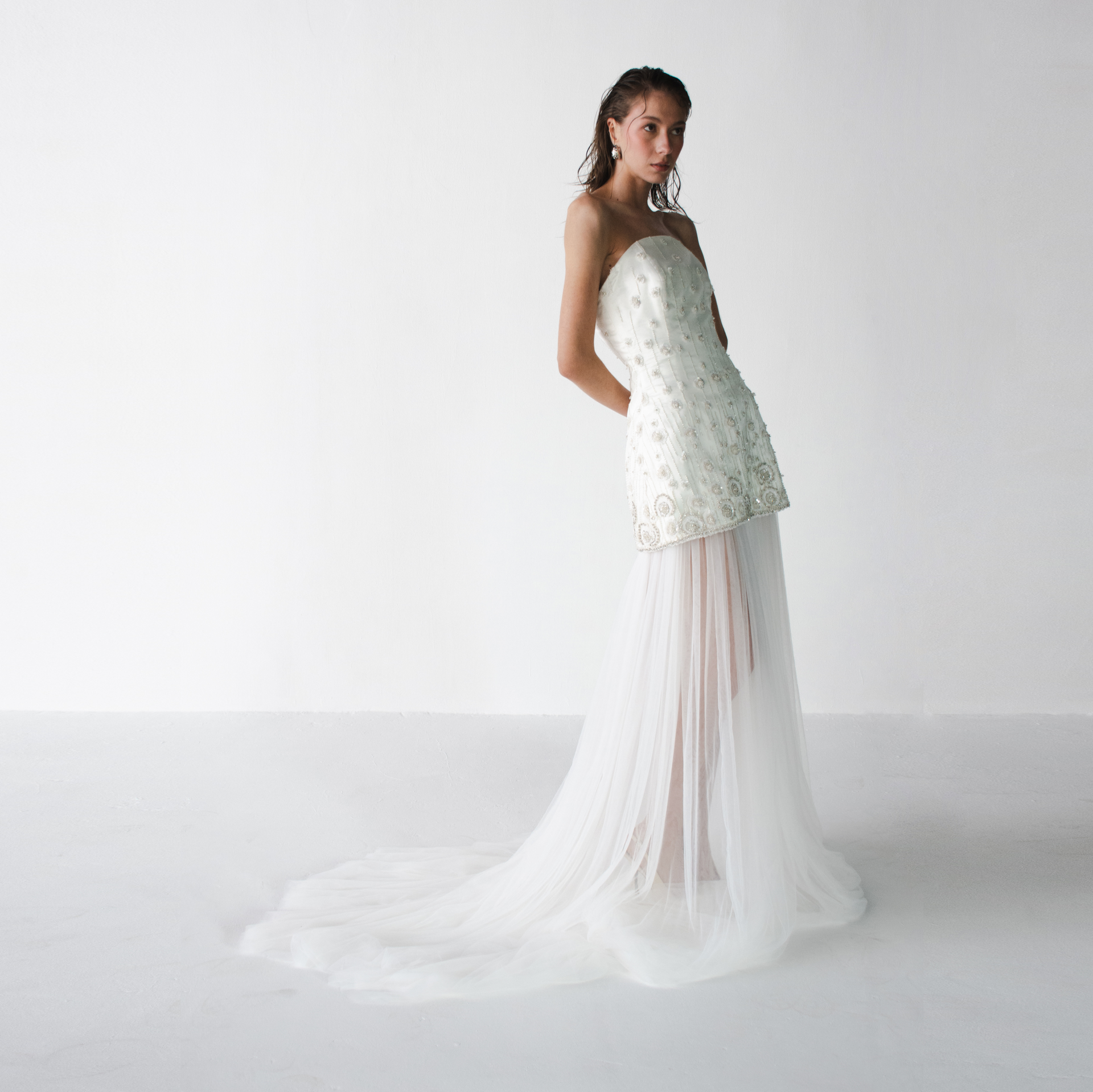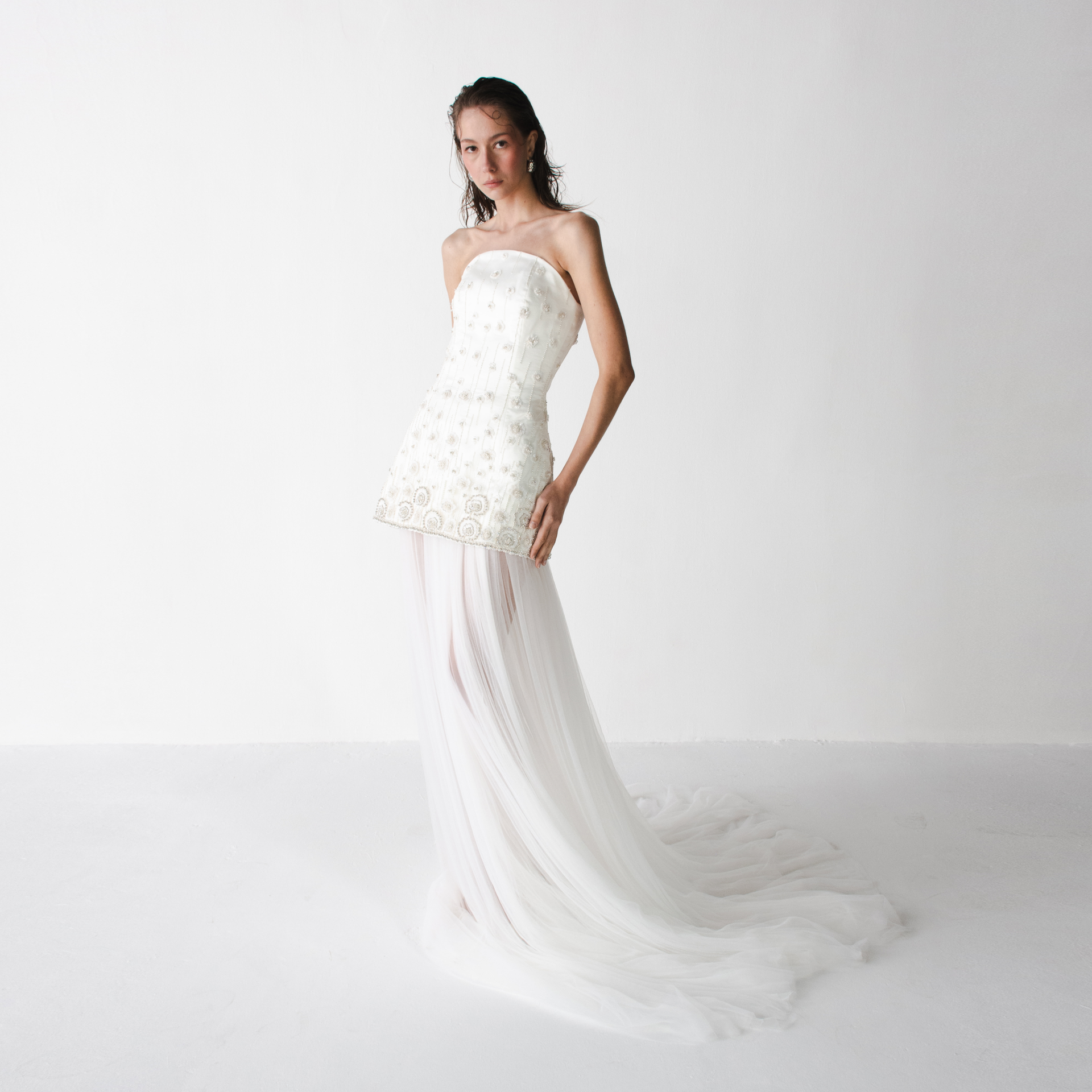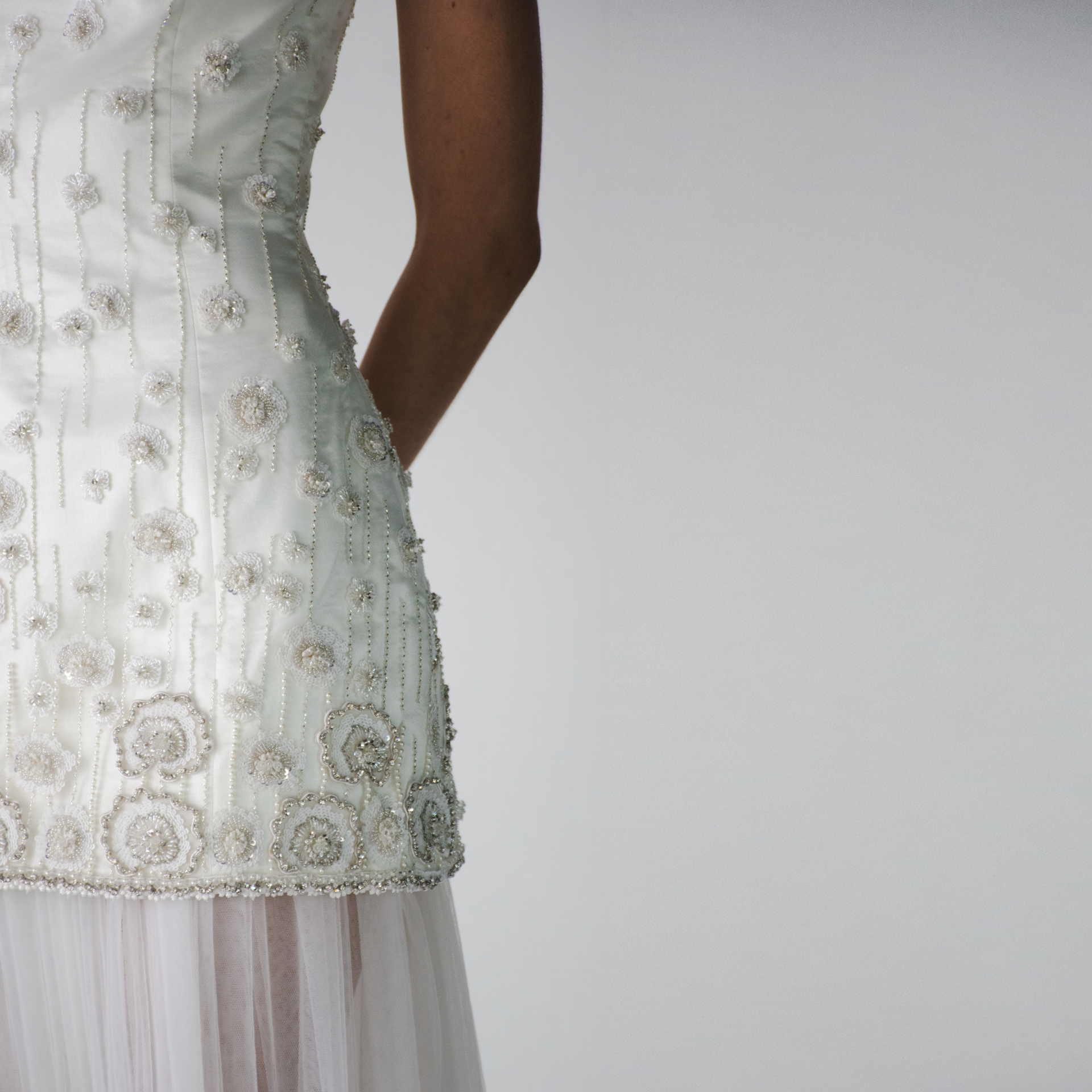 A handcrafted multi-wear dress with an hourglass silhouette, featuring intricate embroidery. Designed for versatility, the modular design allows the skirt and straps to be added or removed for multiple styling options.