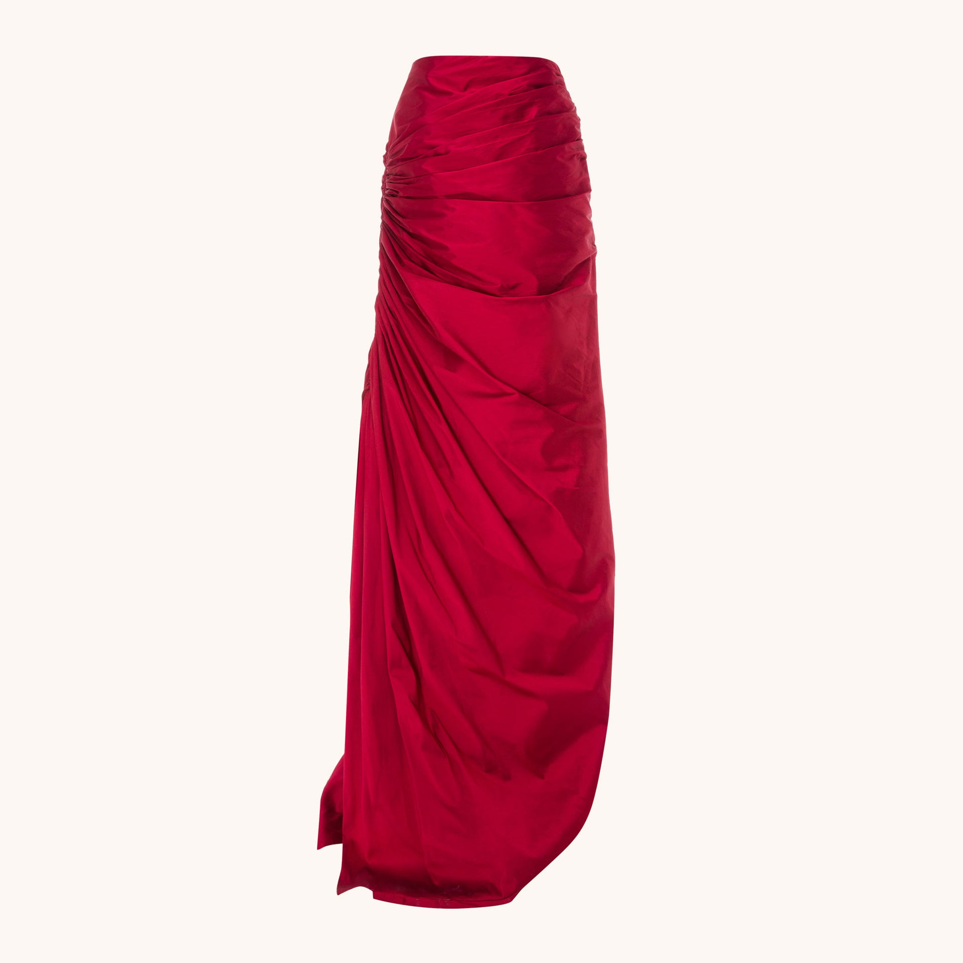 An asymmetrical skirt made out of high quality taffeta silk detailed with red floral embroidery.
