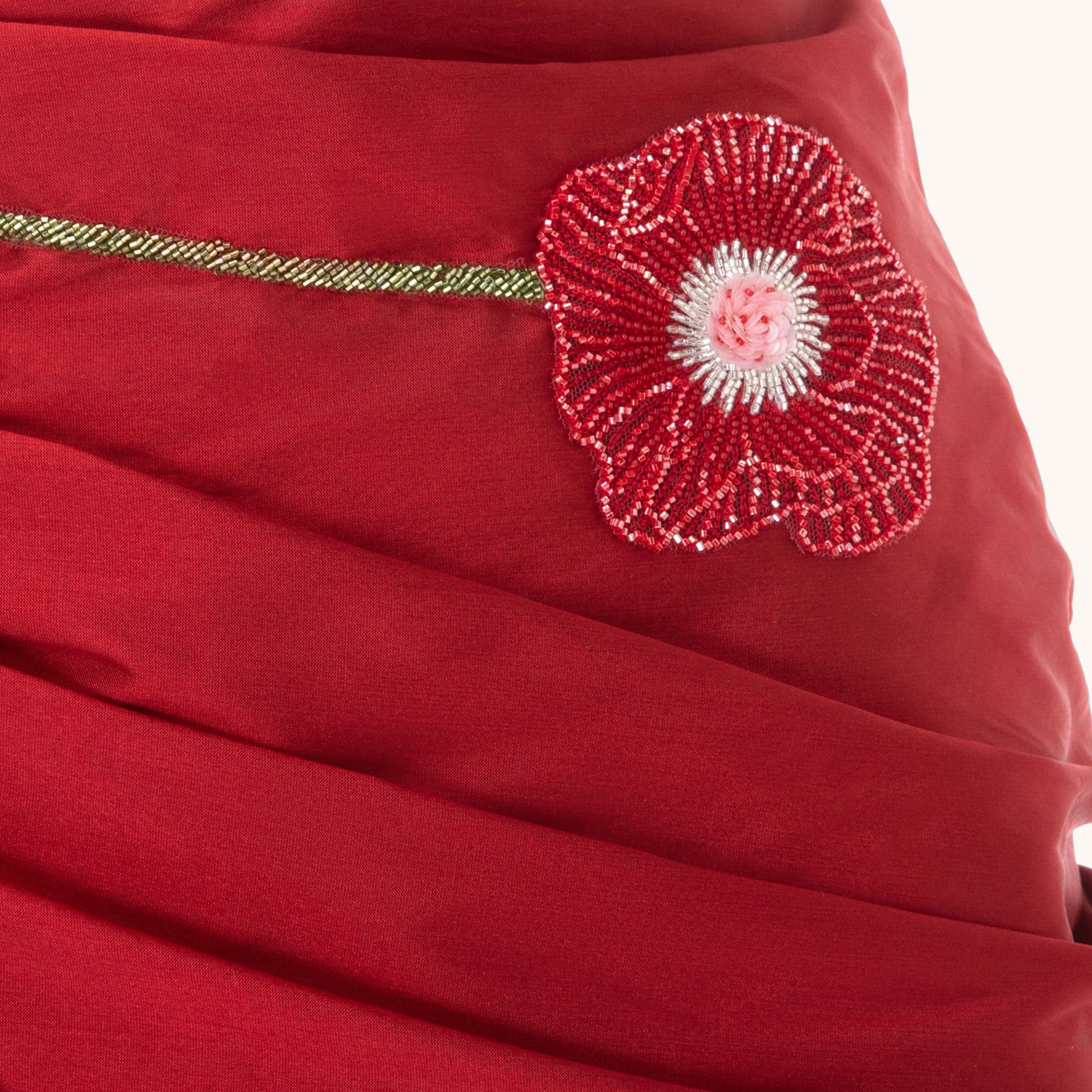Dhs. 2,200.00An asymmetrical skirt made out of high quality taffeta silk detailed with red floral embroidery.