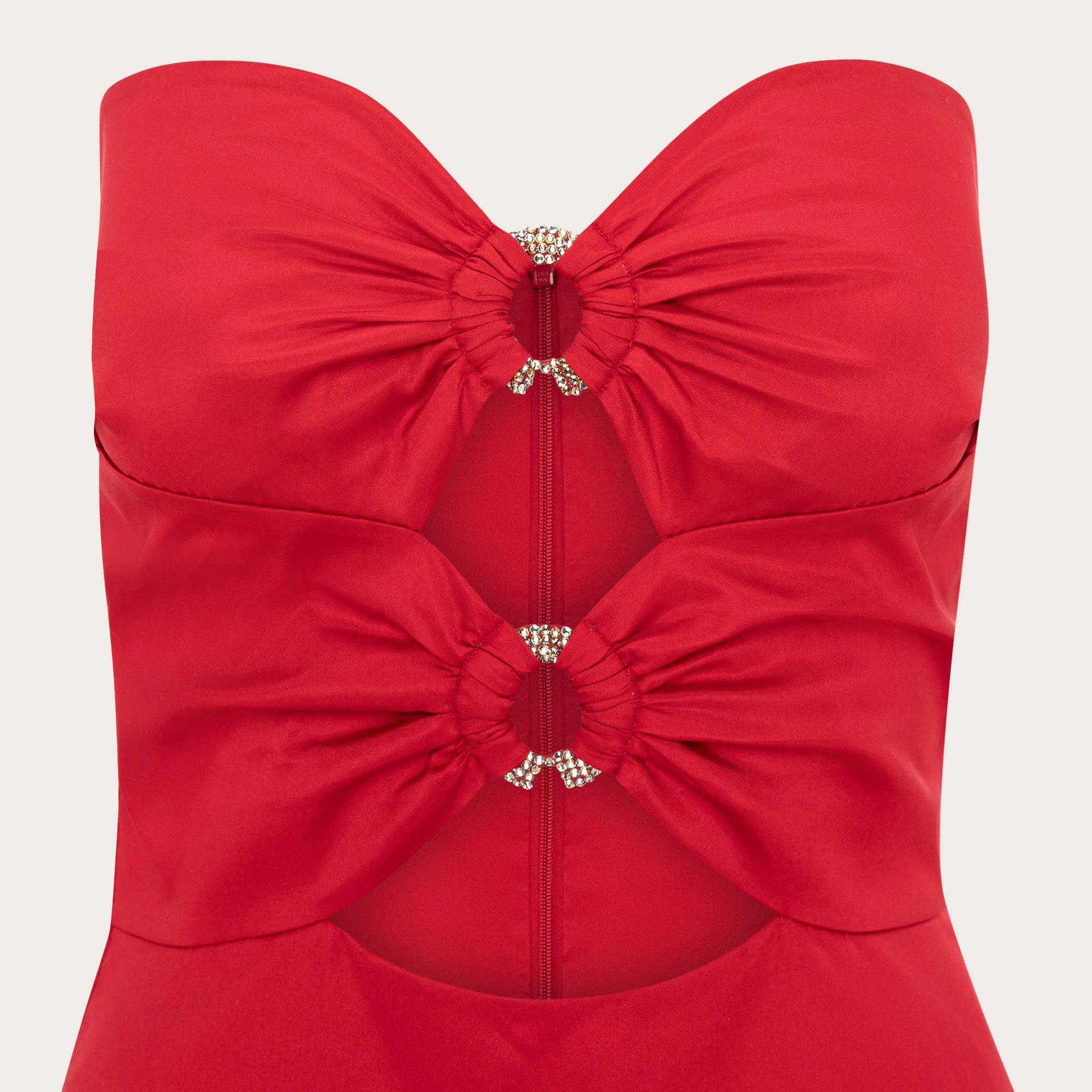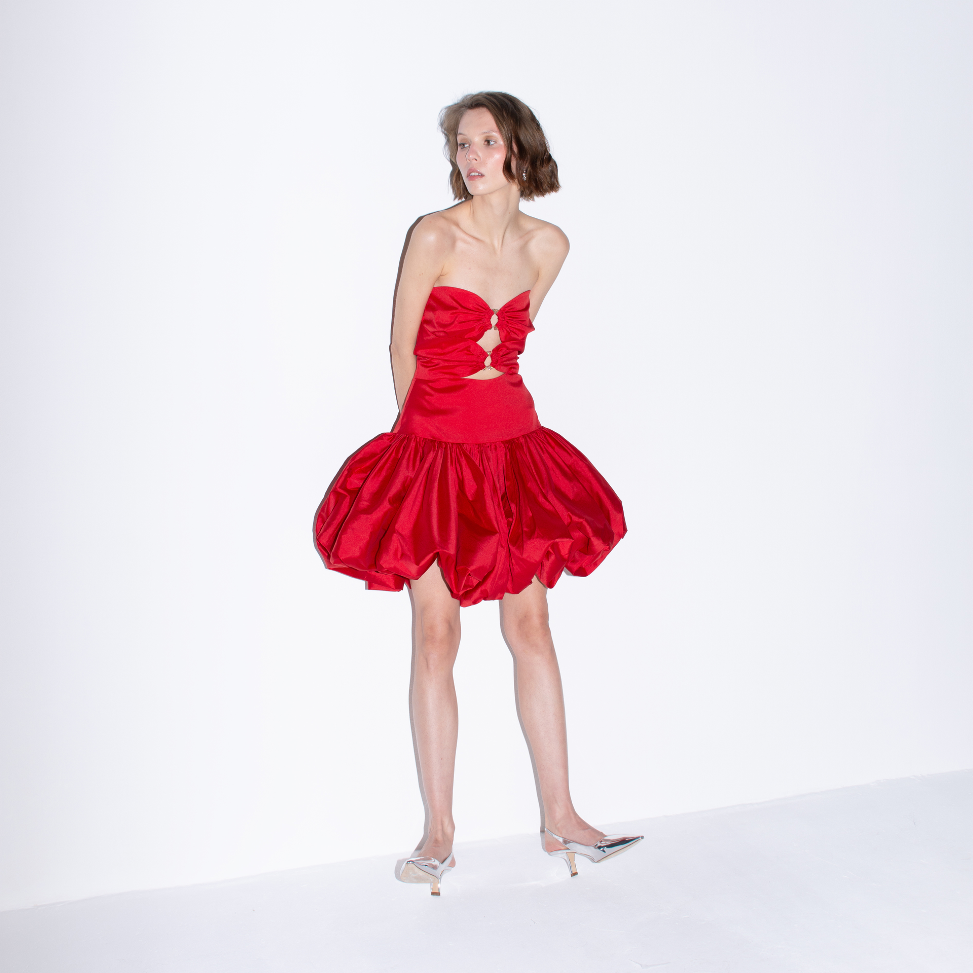 A mini balloon dress in high-quality silk taffeta, designed with a fitted bodice and cut-out details accented by Swarovski crystal rings.