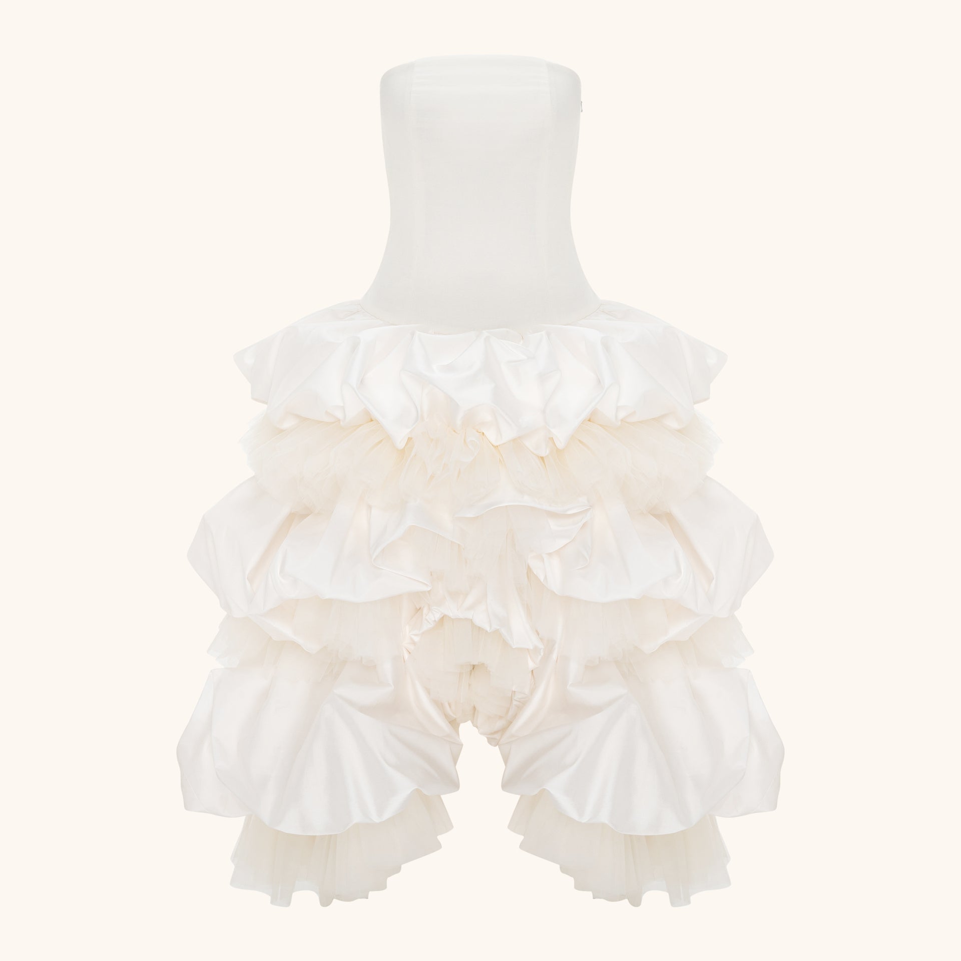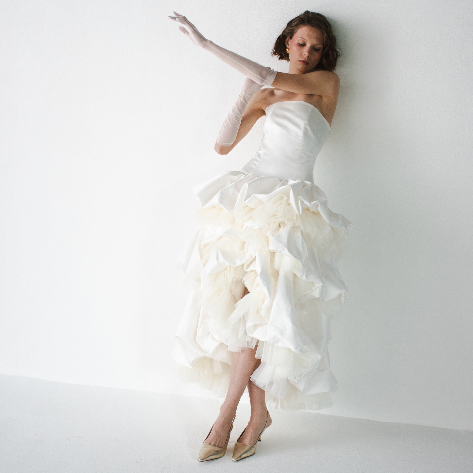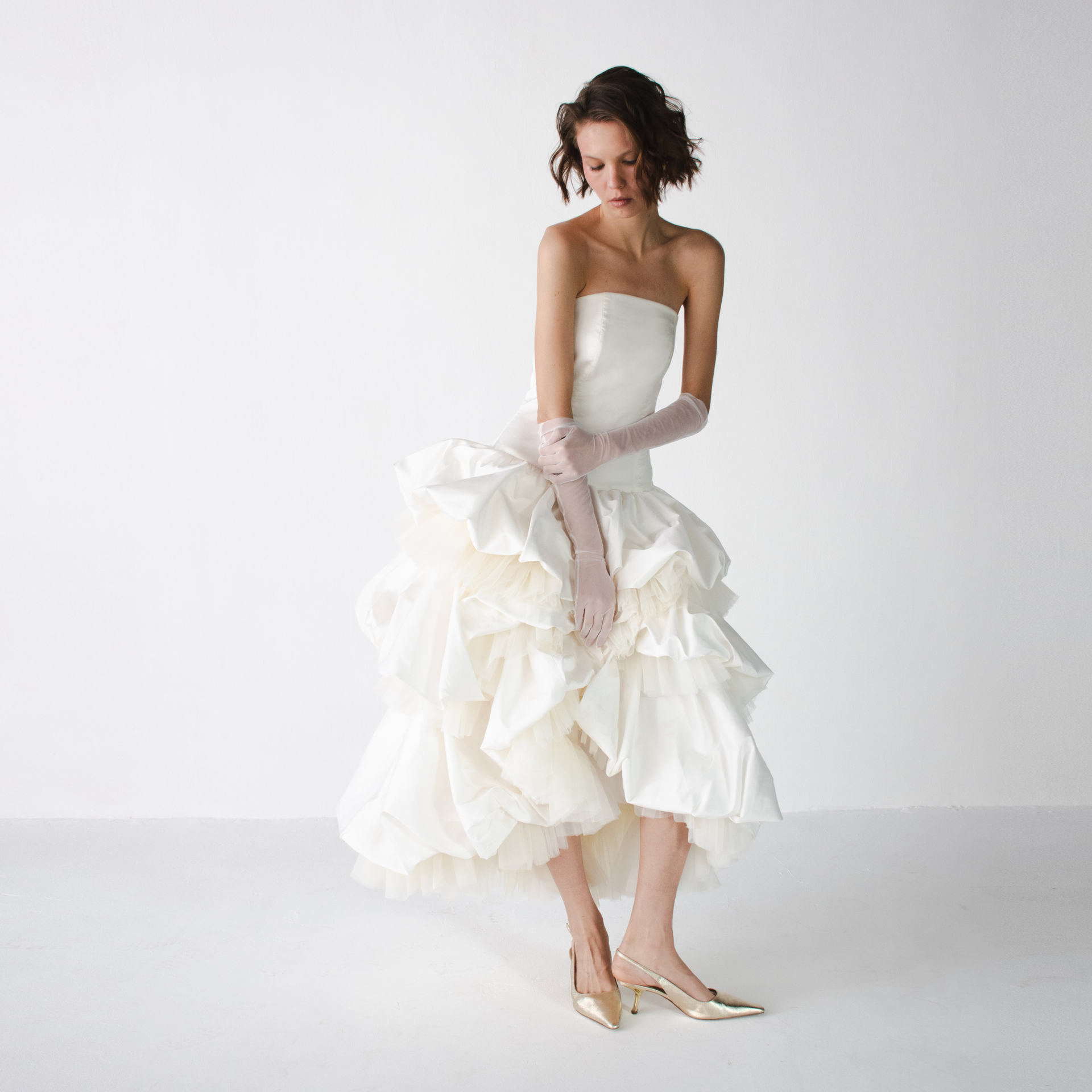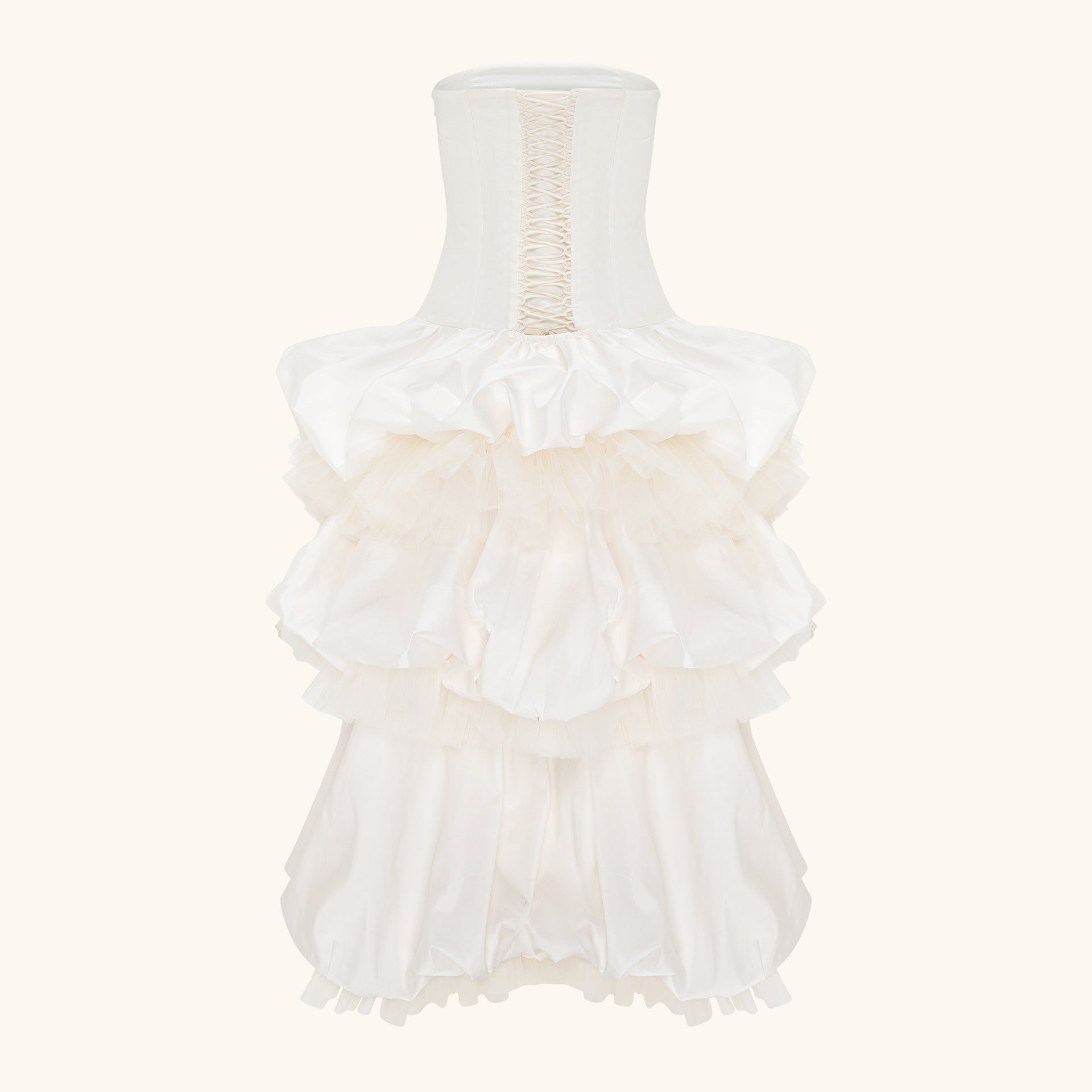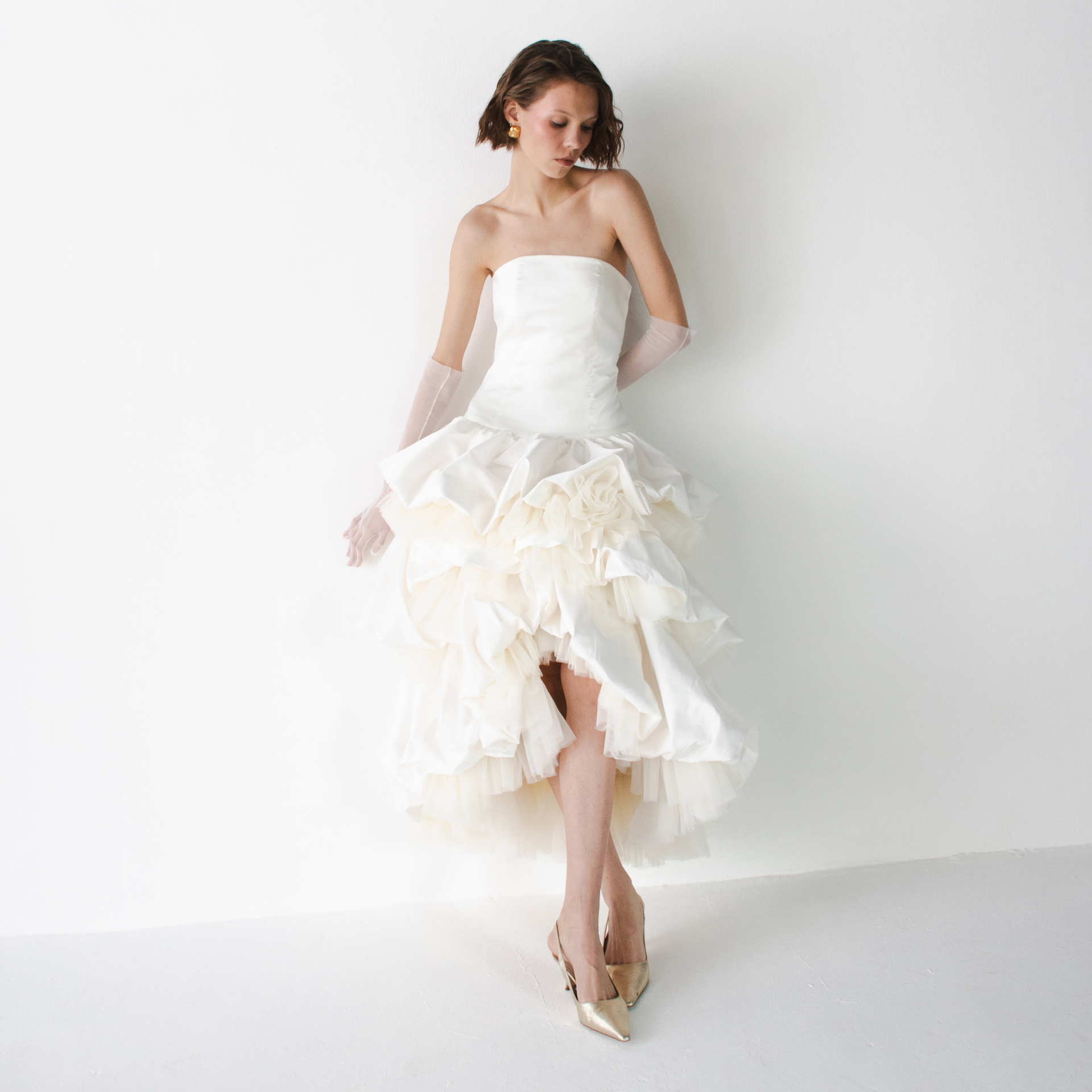 Crafted from high-quality silk taffeta, featuring a fitted bodice that flares into a rose-shaped skirt with layered ruffles and tulle.