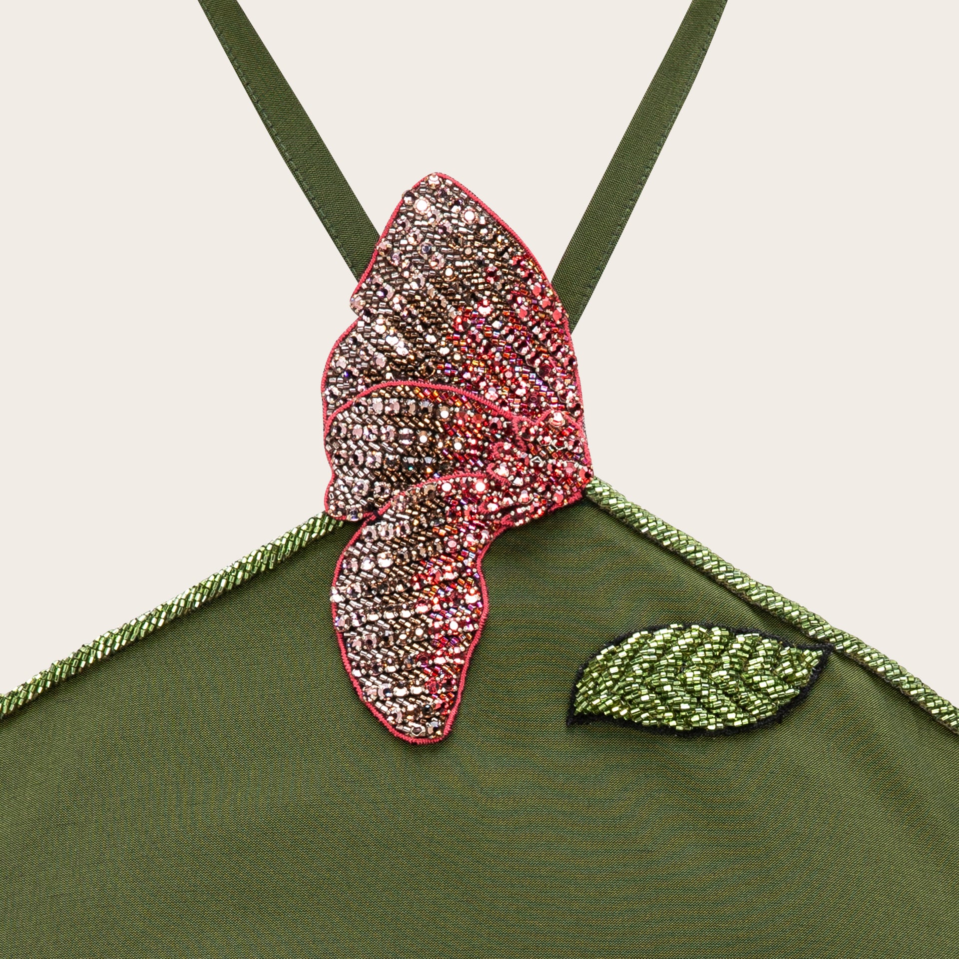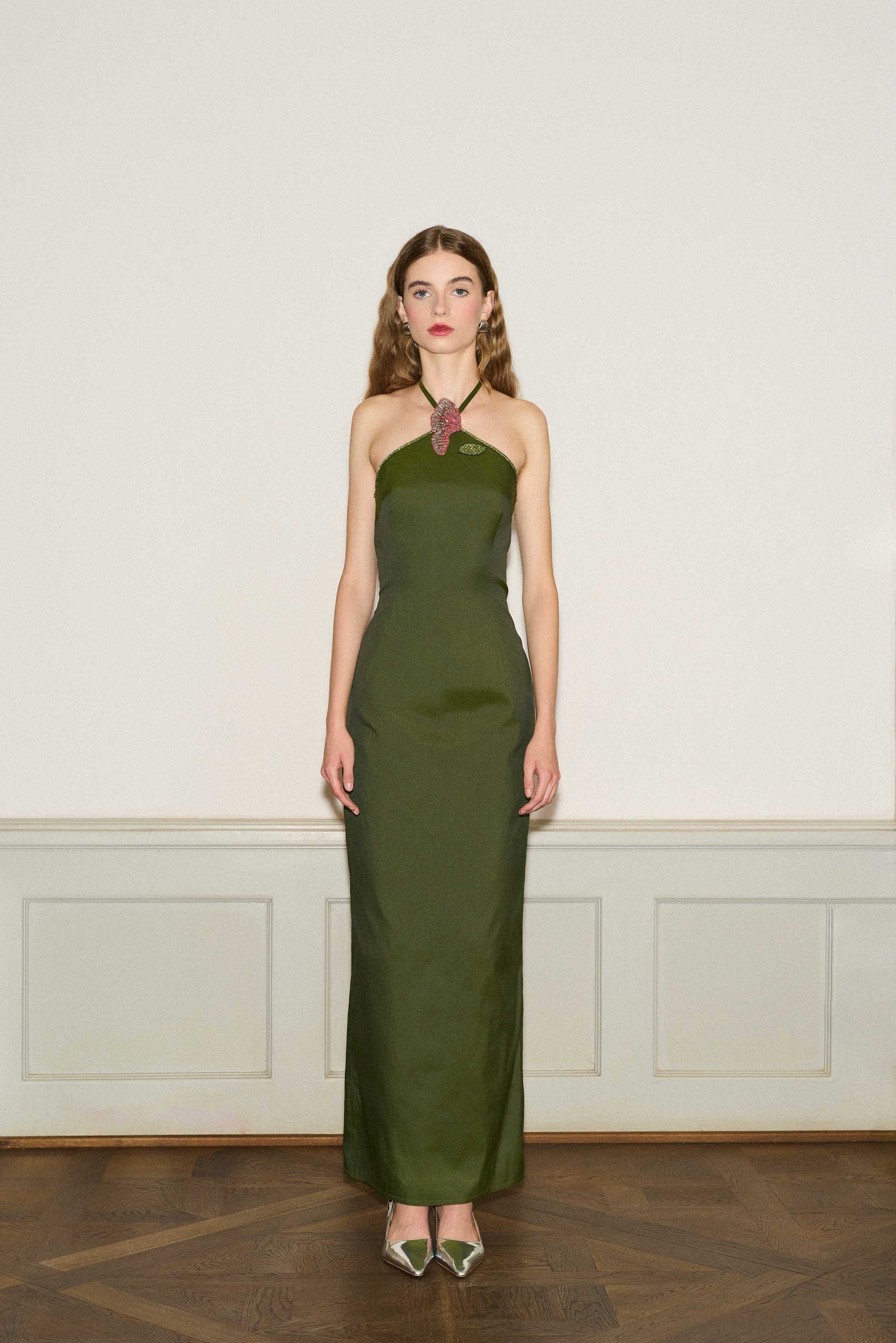 Crafted from high-quality taffeta and has a fitted silhouette. The neckline holds a hand embroidered Poppy flower.