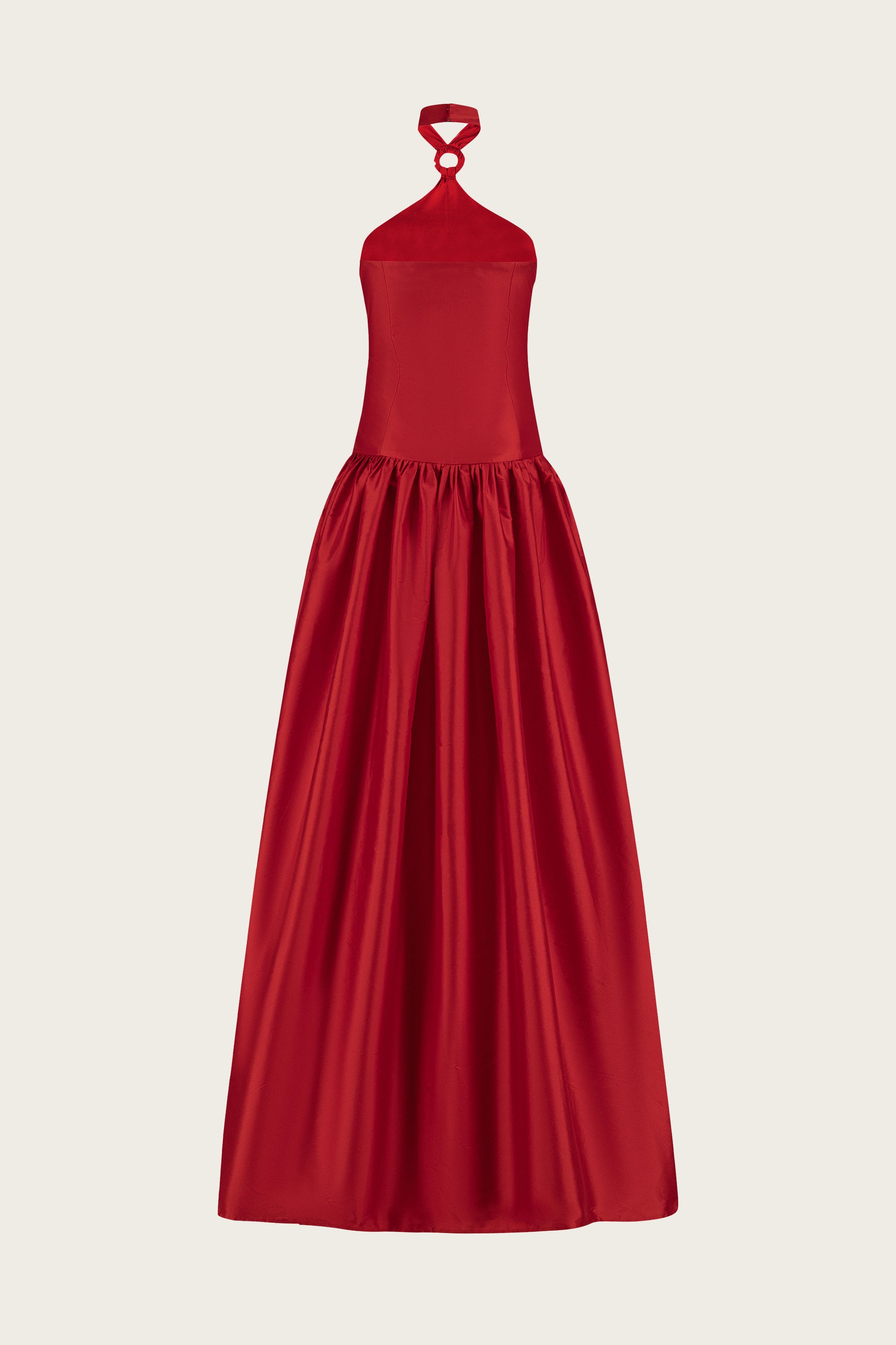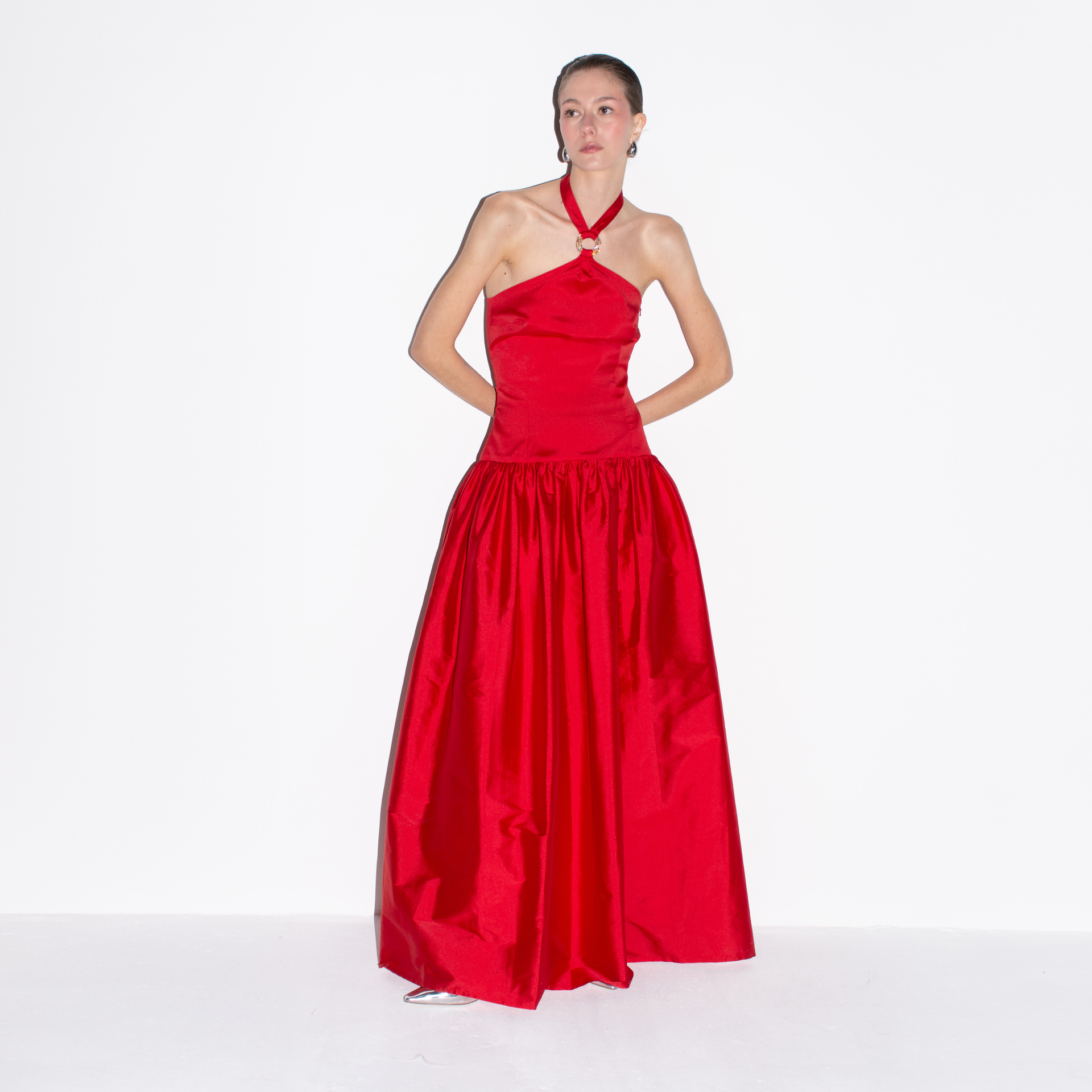 A maxi dress featuring a timeless halter neck and the Autonomie crystal ring