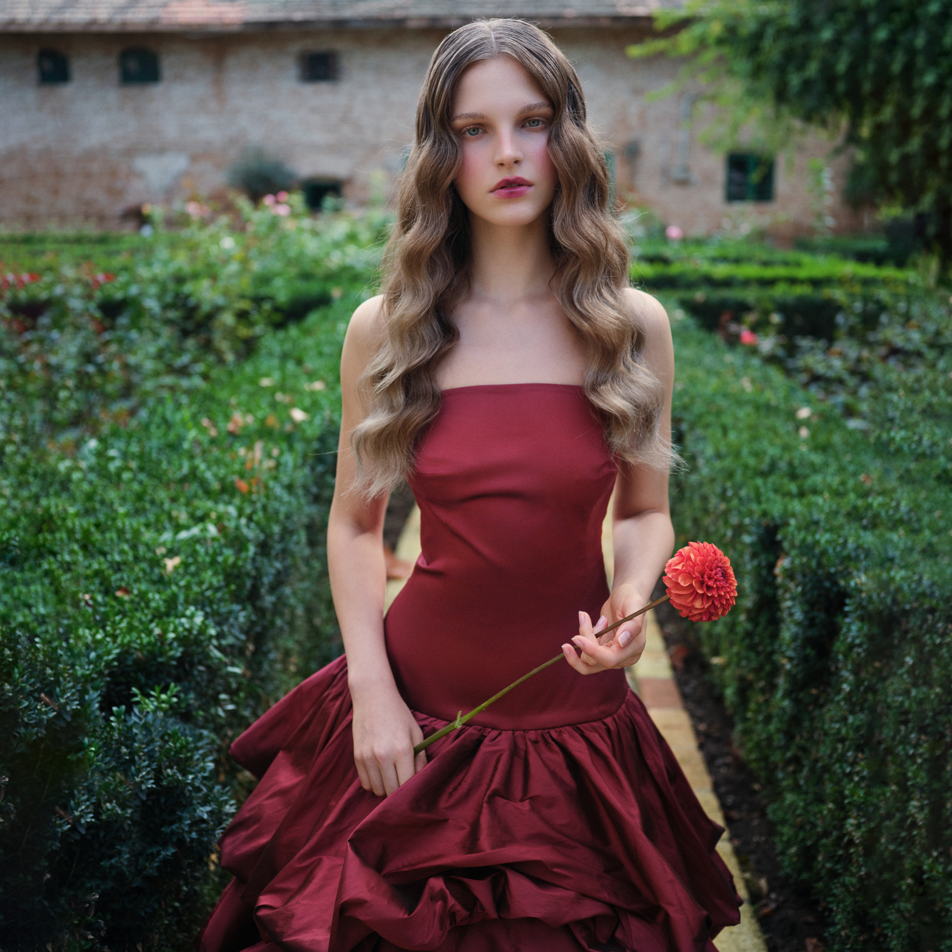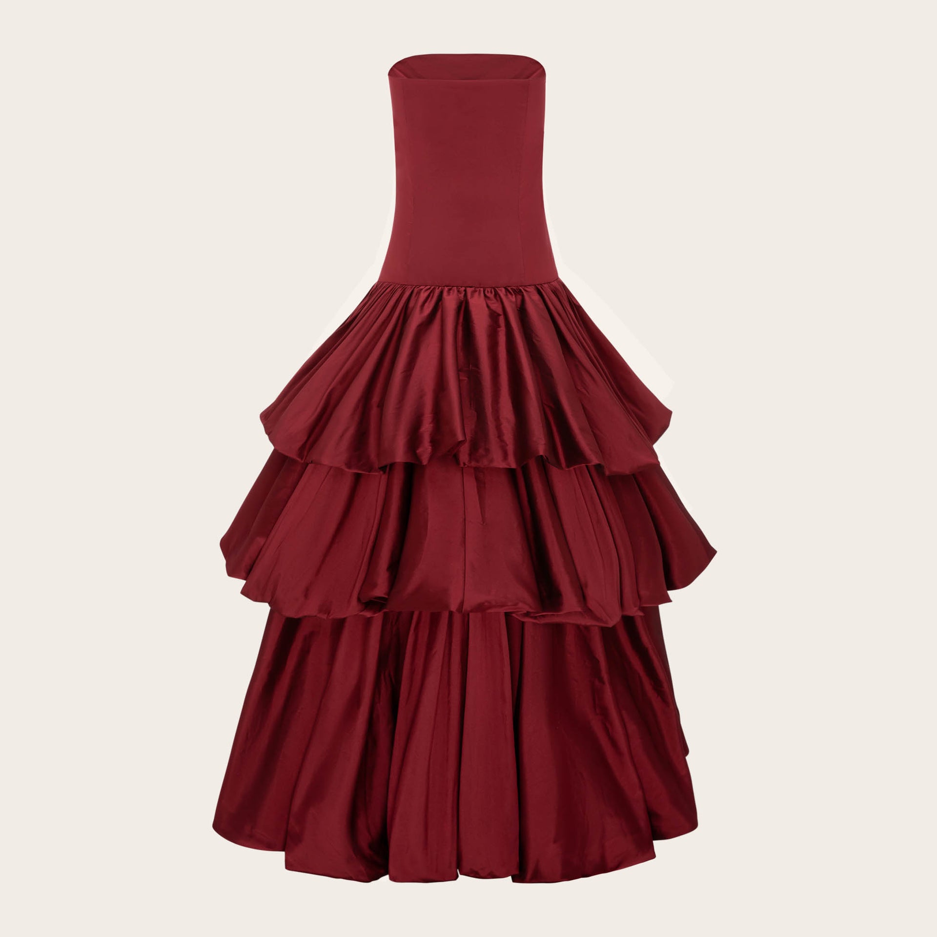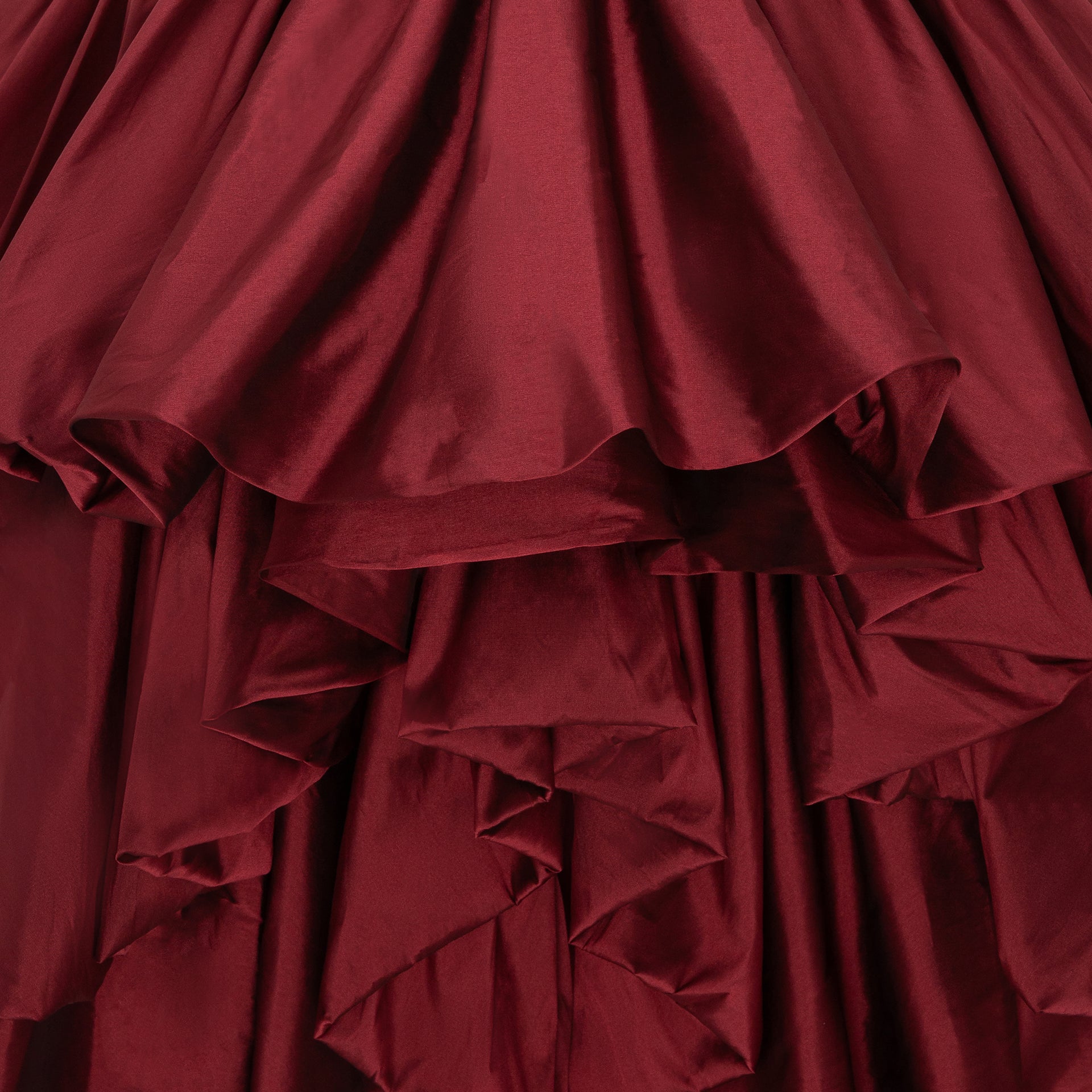 Crafted from high-quality silk taffeta, featuring a fitted bodice that flares out into a Rose shaped skirt with layered ruffles.